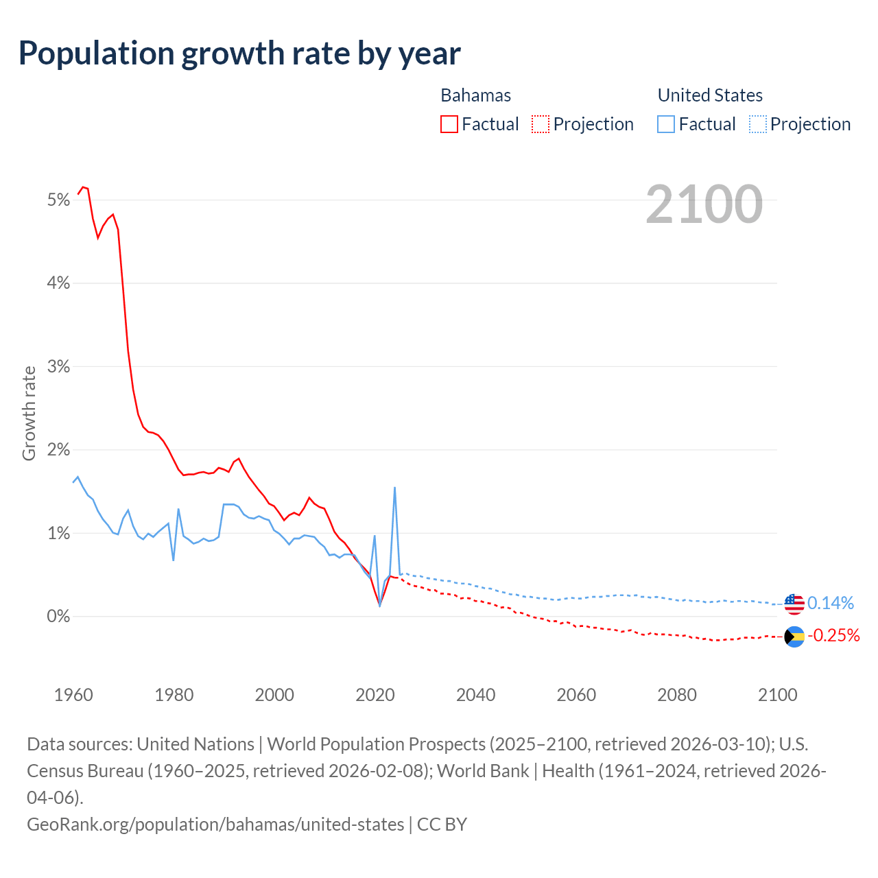 Data sources: World Bank | Health (1960–2024, retrieved 2026-04-06); United Nations | World Population Prospects (1960–2026, retrieved 2026-03-10); U.S. Census Bureau (1960–2025, retrieved 2026-02-08); Central Intelligence Agency (CIA) (2000–2019, retrieved 2026-02-20).