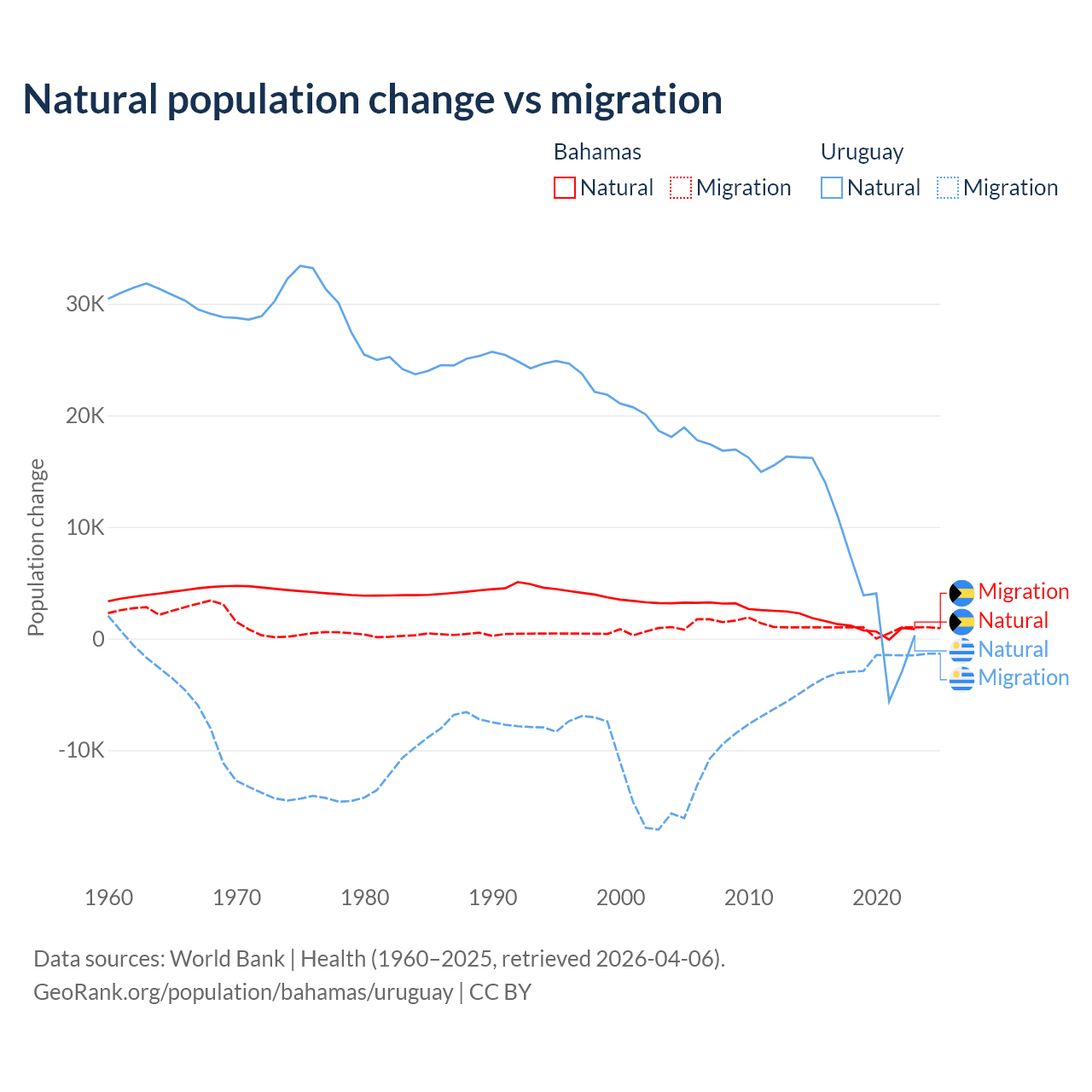Over the last 10 years, 56.9% of the population change in the Bahamas is from natural causes (a gain of 11,209 people) and 43.1% is from migration (a gain of 8,495 people). In Uruguay 70% is from natural causes (a gain of 64,303 people) and 30% is from migration (a loss of 27,501 people).