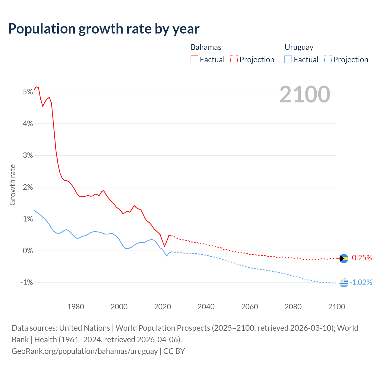 - For the last 10 years, the Bahamas has had an average growth rate of +0.52% per year vs +0.11% in Uruguay.