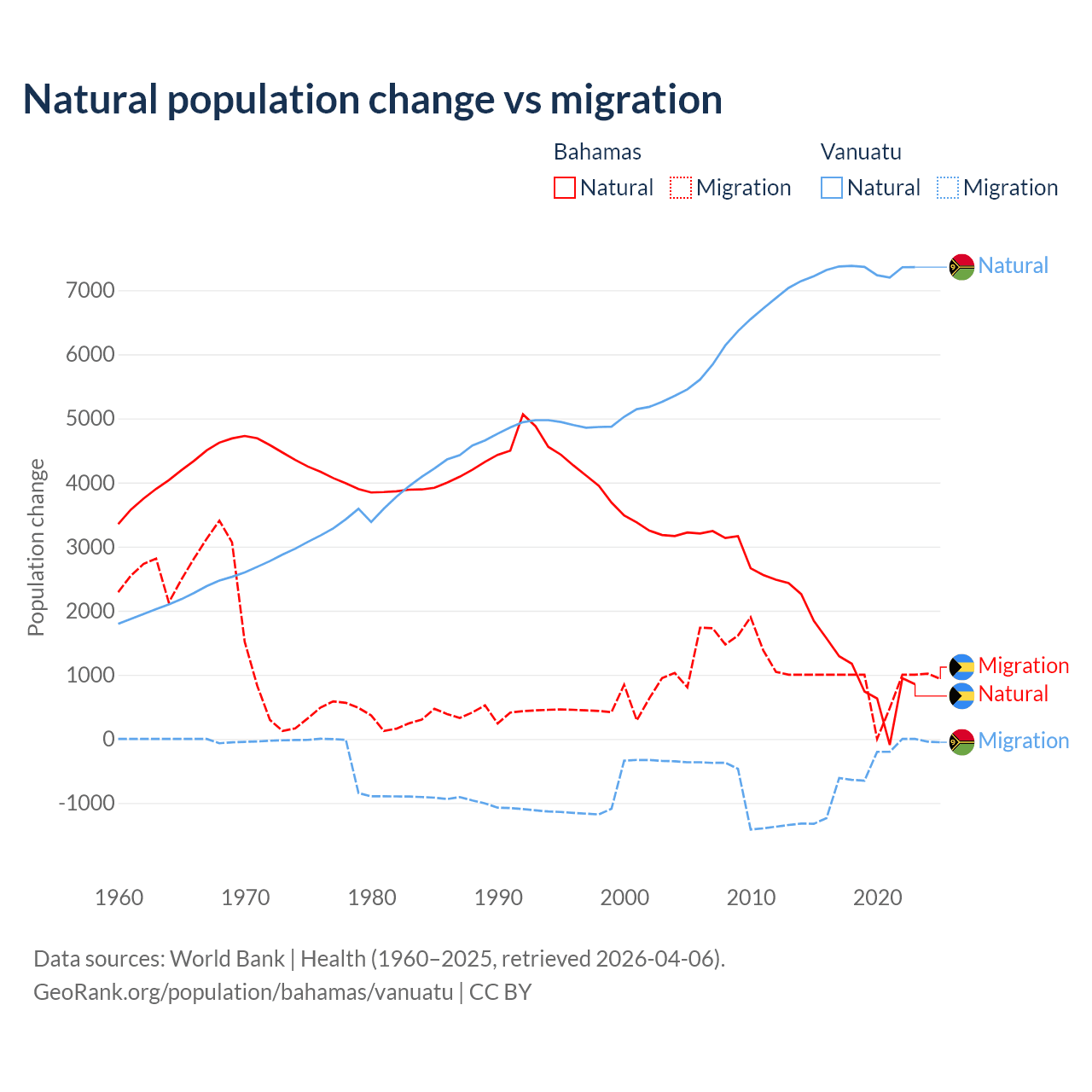 Over the last 10 years, 56.9% of the population change in the Bahamas is from natural causes (a gain of 11,209 people) and 43.1% is from migration (a gain of 8,495 people). In Vanuatu 92.2% is from natural causes (a gain of 72,941 people) and 7.81% is from migration (a loss of 6,181 people).