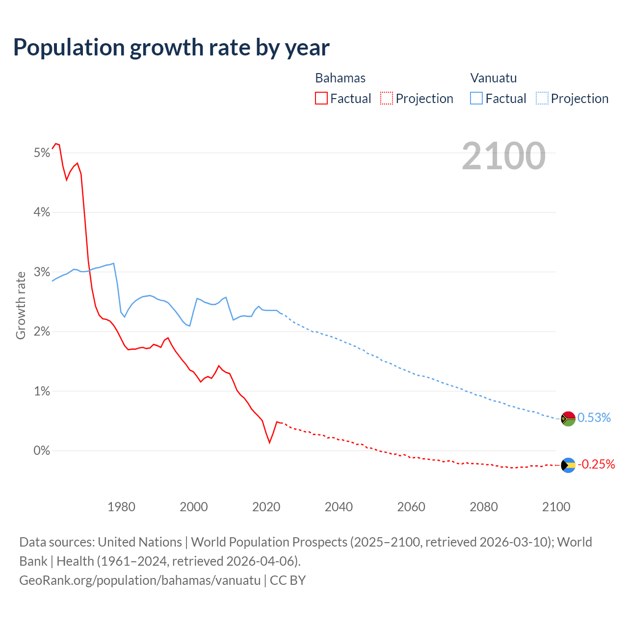 - For the last 10 years, the Bahamas has had an average growth rate of +0.52% per year vs +2.33% in Vanuatu.