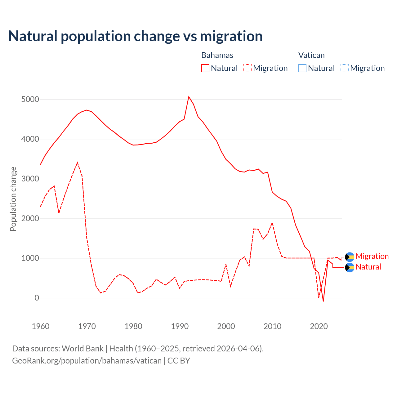 - For the last 10 years, the Bahamas has had an average growth rate of +0.52% per year vs +1.9% in the Vatican.