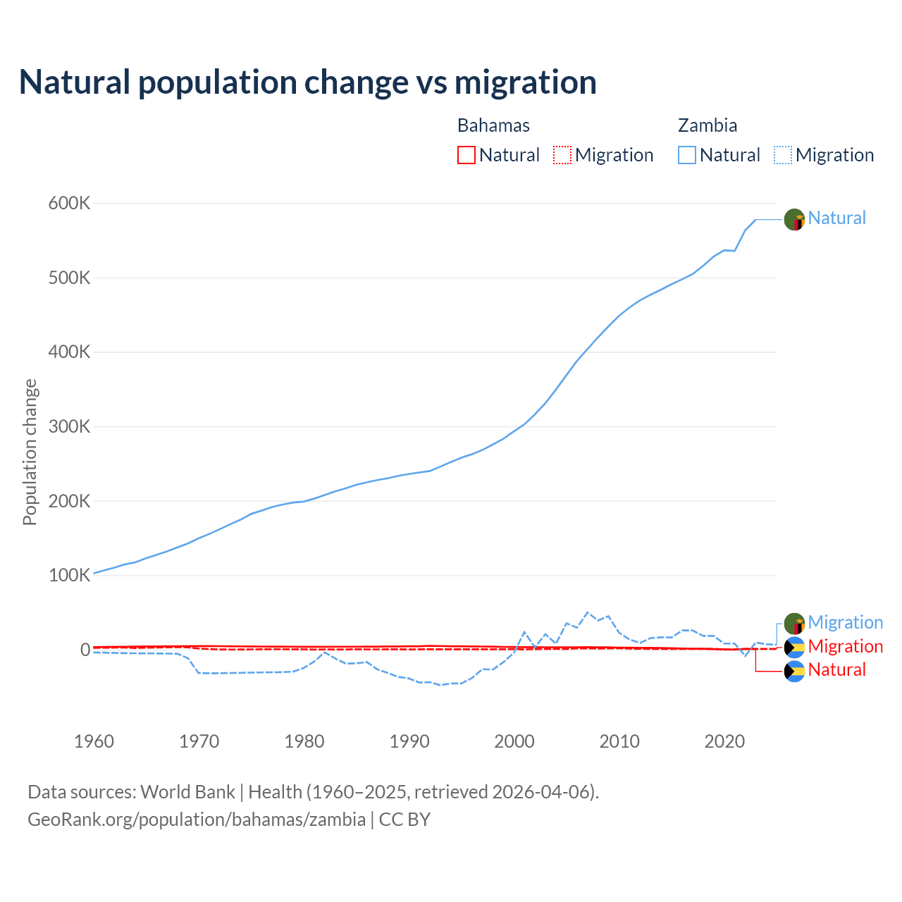 Over the last 10 years, 56.9% of the population change in the Bahamas is from natural causes (a gain of 11,209 people) and 43.1% is from migration (a gain of 8,495 people). In Zambia 97.4% is from natural causes (a gain of 5,233,797 people) and 2.58% is from migration (a gain of 138,554 people).
