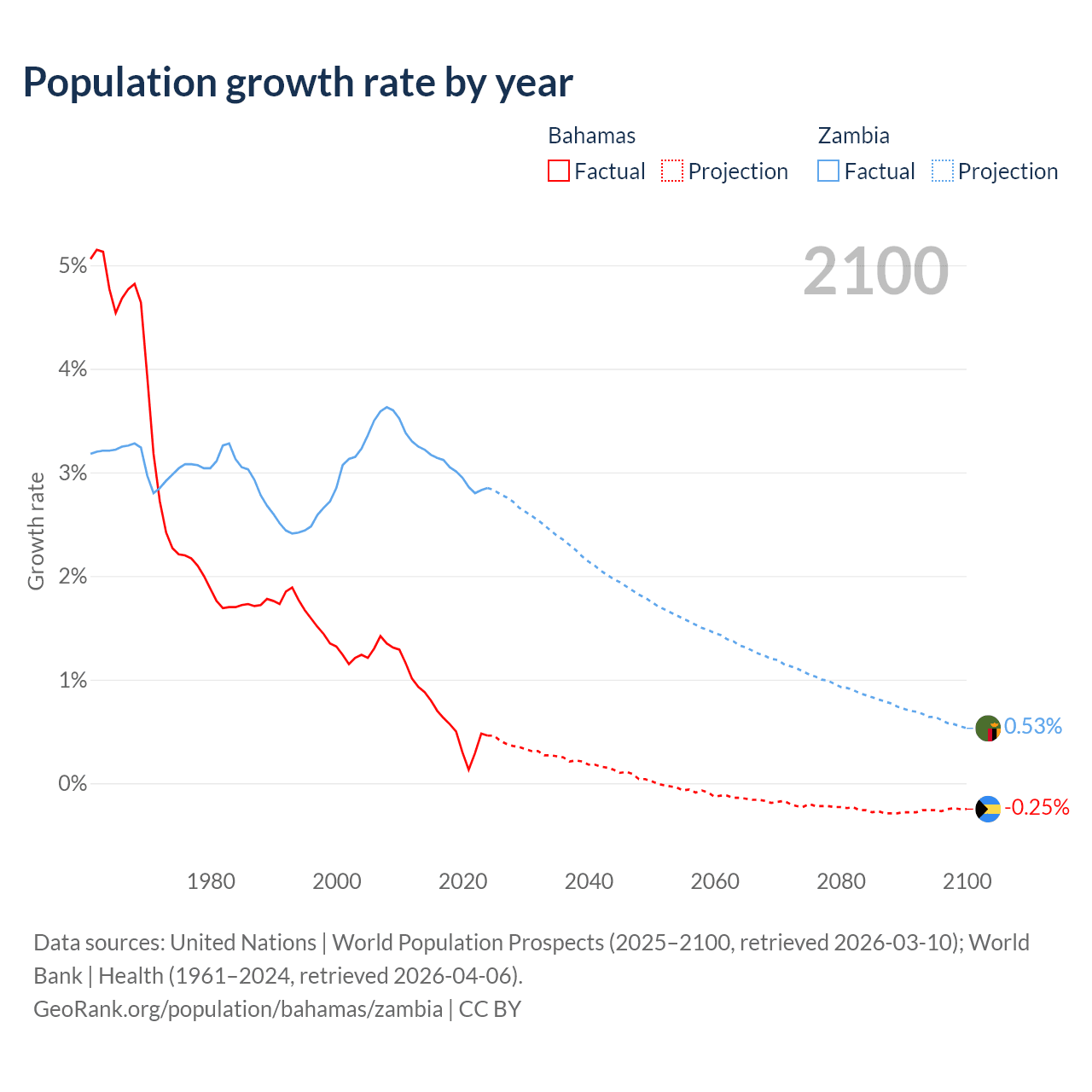 - For the last 10 years, the Bahamas has had an average growth rate of +0.52% per year vs +3% in Zambia.