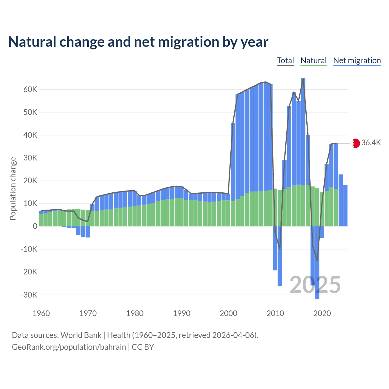 Over the last 10 years, 55.9% of the population change in Bahrain is from natural causes (a gain of 170,110 people) and 44.1% is from migration (a gain of 134,281 people).