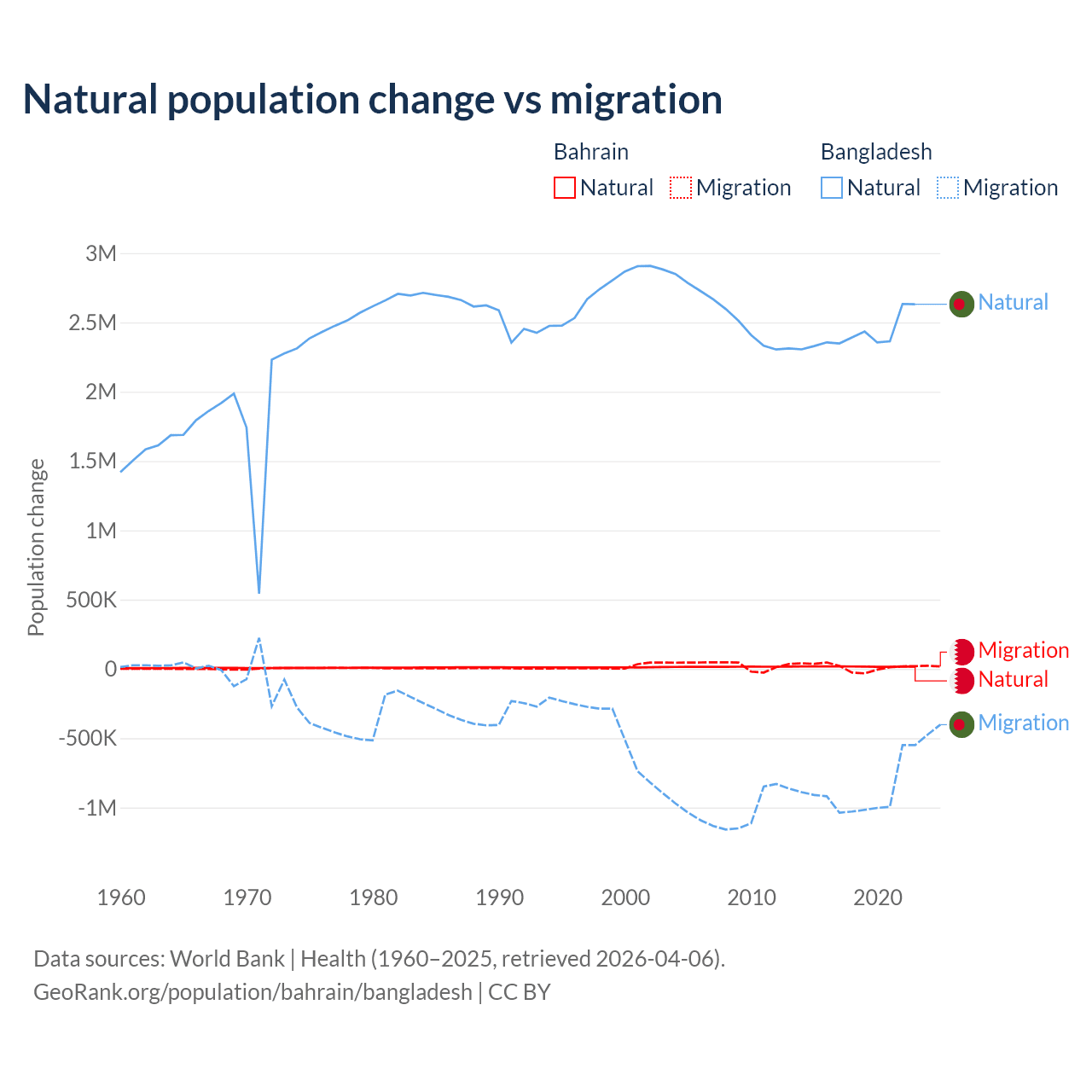 Over the last 10 years, 55.9% of the population change in Bahrain is from natural causes (a gain of 170,110 people) and 44.1% is from migration (a gain of 134,281 people). In Bangladesh 73.1% is from natural causes (a gain of 24,148,039 people) and 26.9% is from migration (a loss of 8,897,408 people).