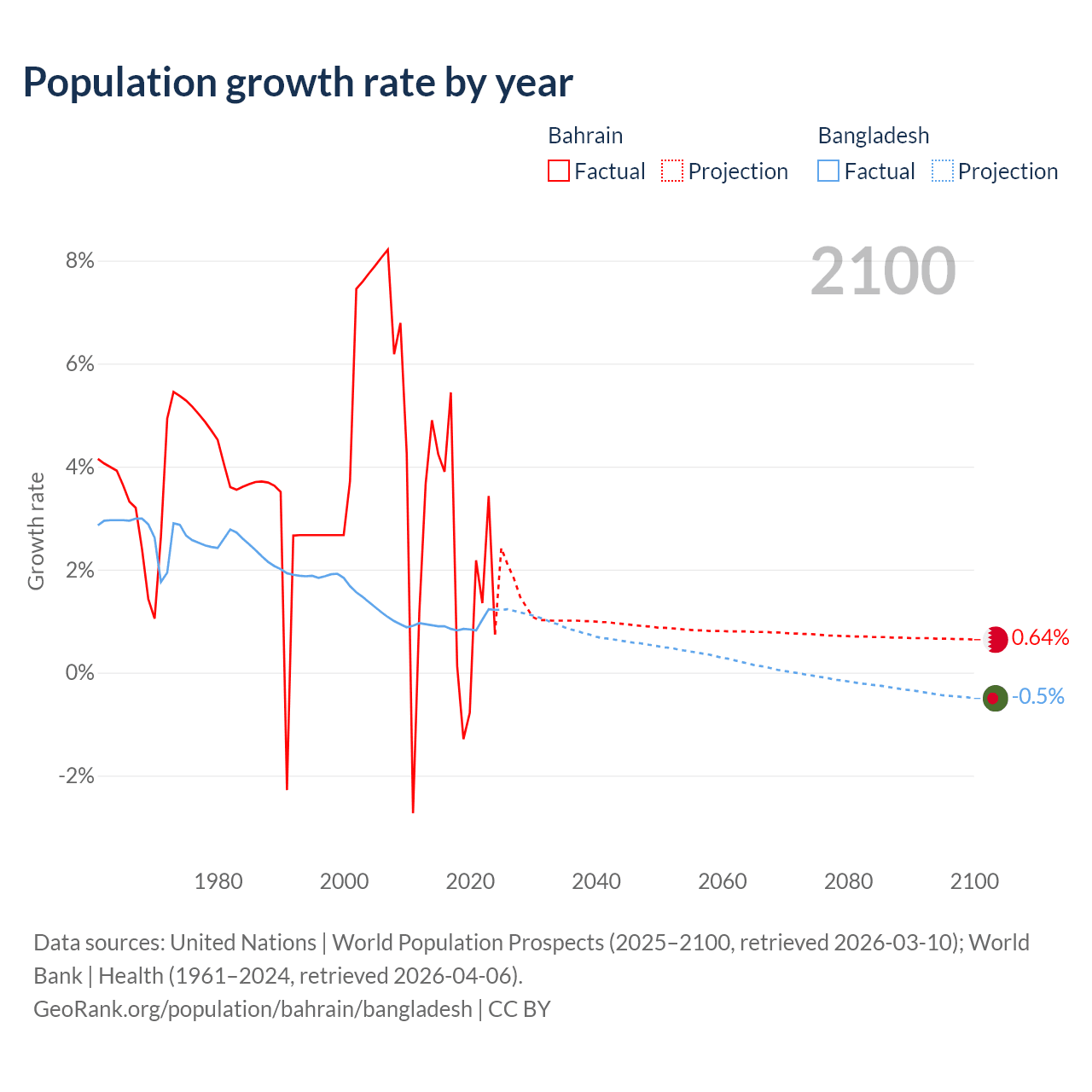 - For the last 10 years, Bahrain has had an average growth rate of +2.2% per year vs +0.94% in Bangladesh.