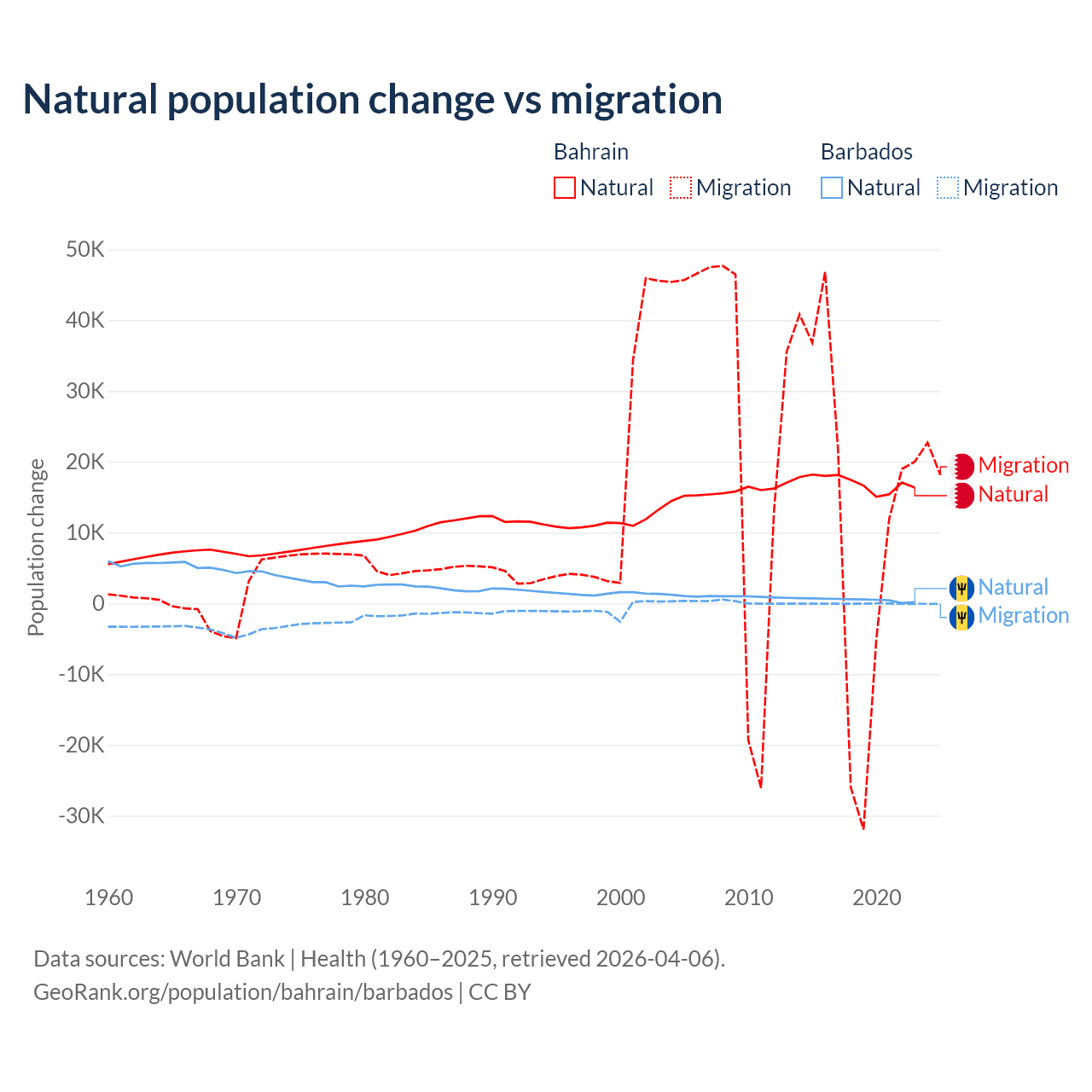 Over the last 10 years, 55.9% of the population change in Bahrain is from natural causes (a gain of 170,110 people) and 44.1% is from migration (a gain of 134,281 people). In Barbados 89.5% is from natural causes (a gain of 4,936 people) and 10.5% is from migration (a loss of 578 people).