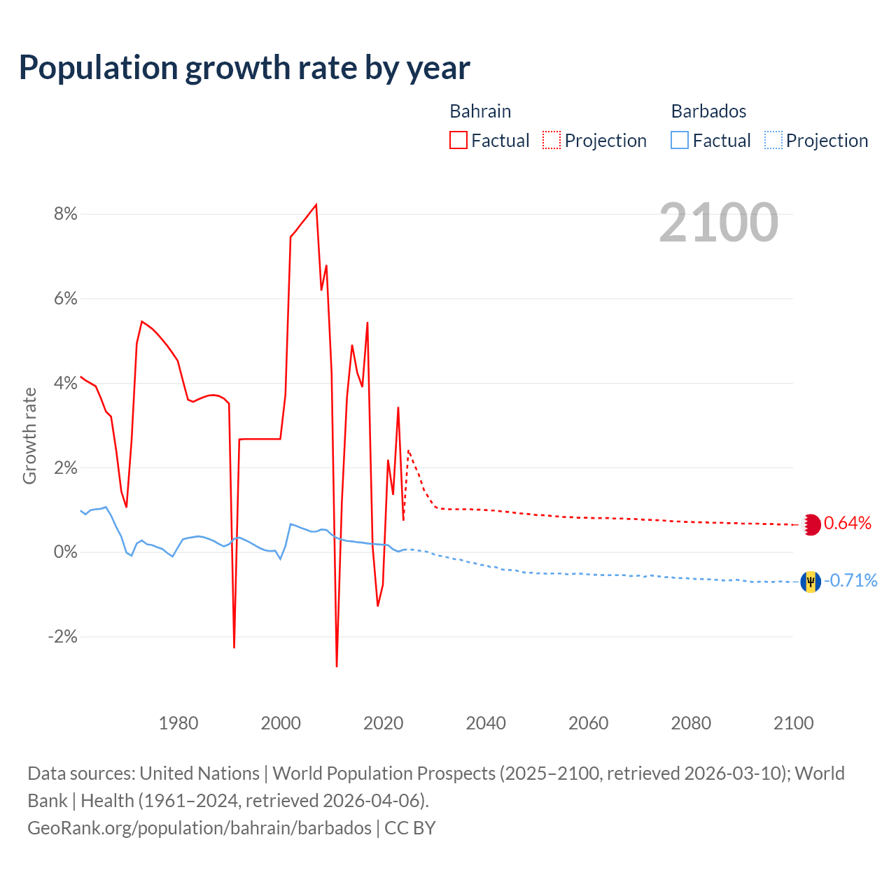 - For the last 10 years, Bahrain has had an average growth rate of +2.2% per year vs +0.16% in Barbados.