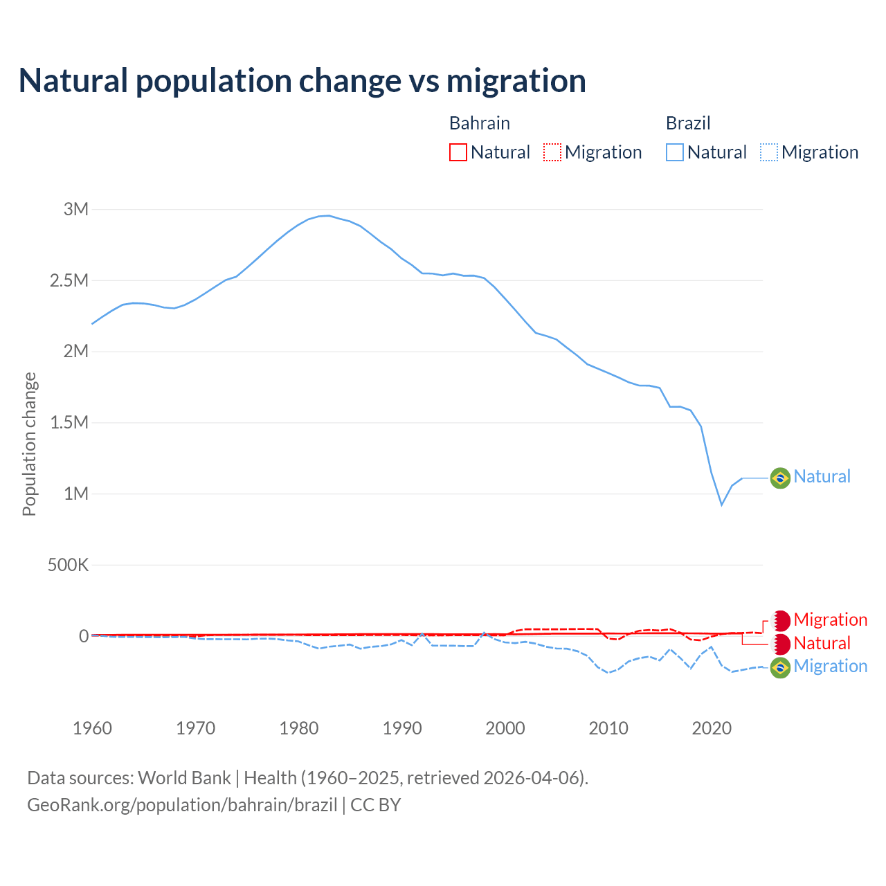 Over the last 10 years, 55.9% of the population change in Bahrain is from natural causes (a gain of 170,110 people) and 44.1% is from migration (a gain of 134,281 people). In Brazil 89.1% is from natural causes (a gain of 14,004,164 people) and 10.9% is from migration (a loss of 1,708,894 people).