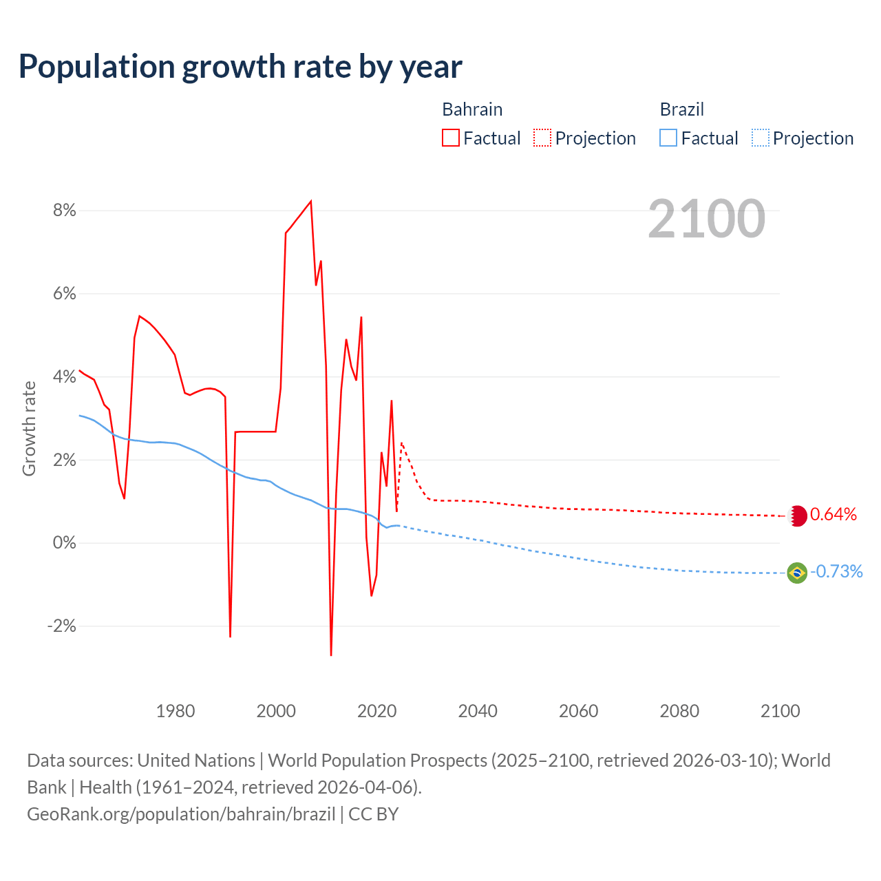 - For the last 10 years, Bahrain has had an average growth rate of +2.2% per year vs +0.6% in Brazil.