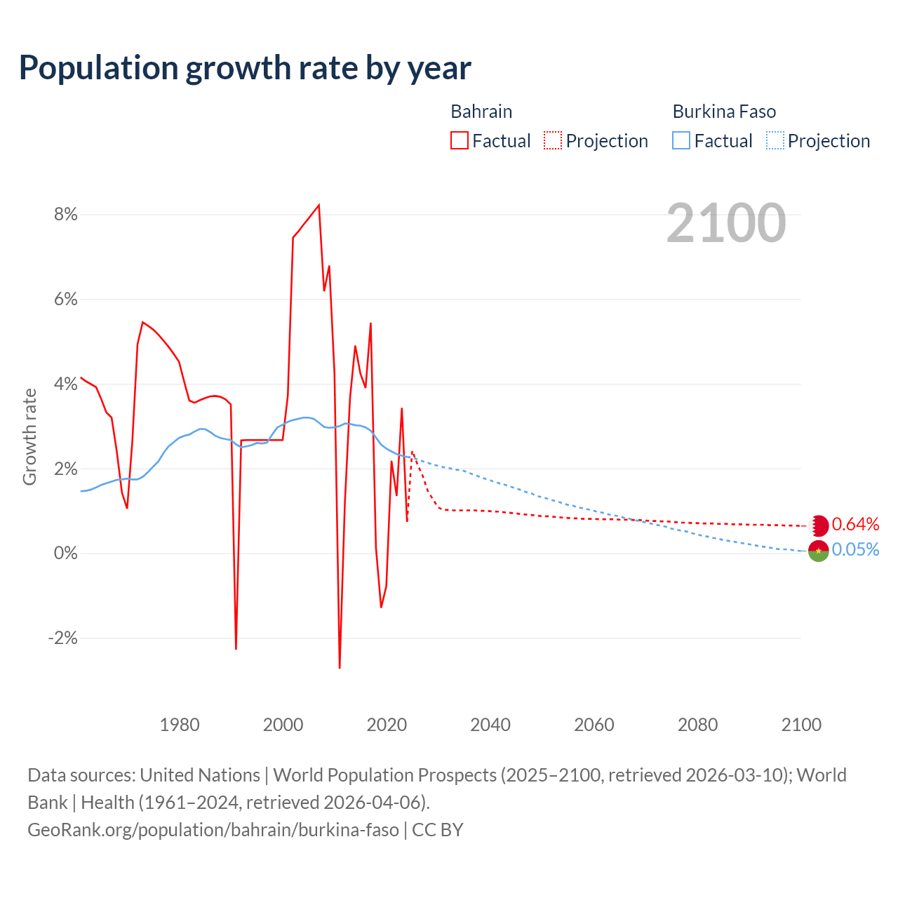 - For the last 10 years, Bahrain has had an average growth rate of +2.2% per year vs +2.63% in Burkina Faso.