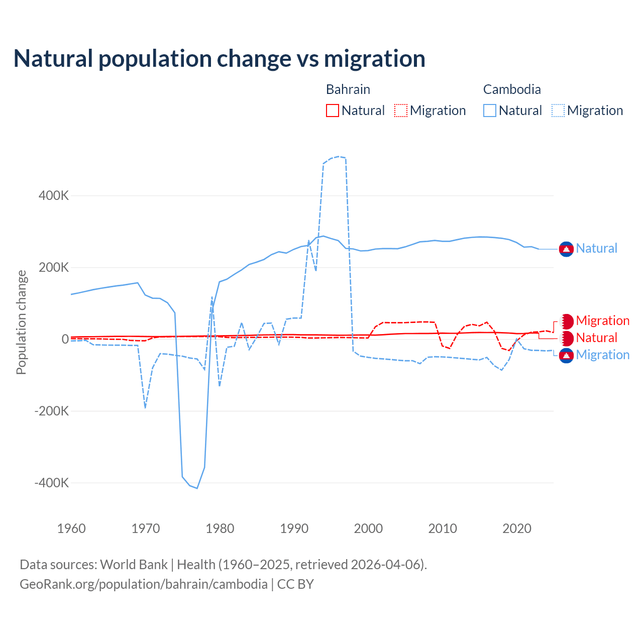 Over the last 10 years, 55.9% of the population change in Bahrain is from natural causes (a gain of 170,110 people) and 44.1% is from migration (a gain of 134,281 people). In Cambodia 85.2% is from natural causes (a gain of 2,724,147 people) and 14.8% is from migration (a loss of 474,505 people).