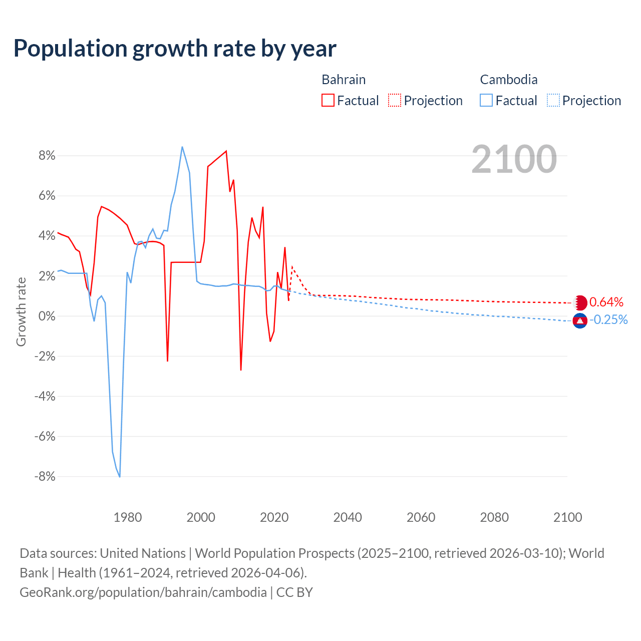 - For the last 10 years, Bahrain has had an average growth rate of +2.2% per year vs +1.38% in Cambodia.