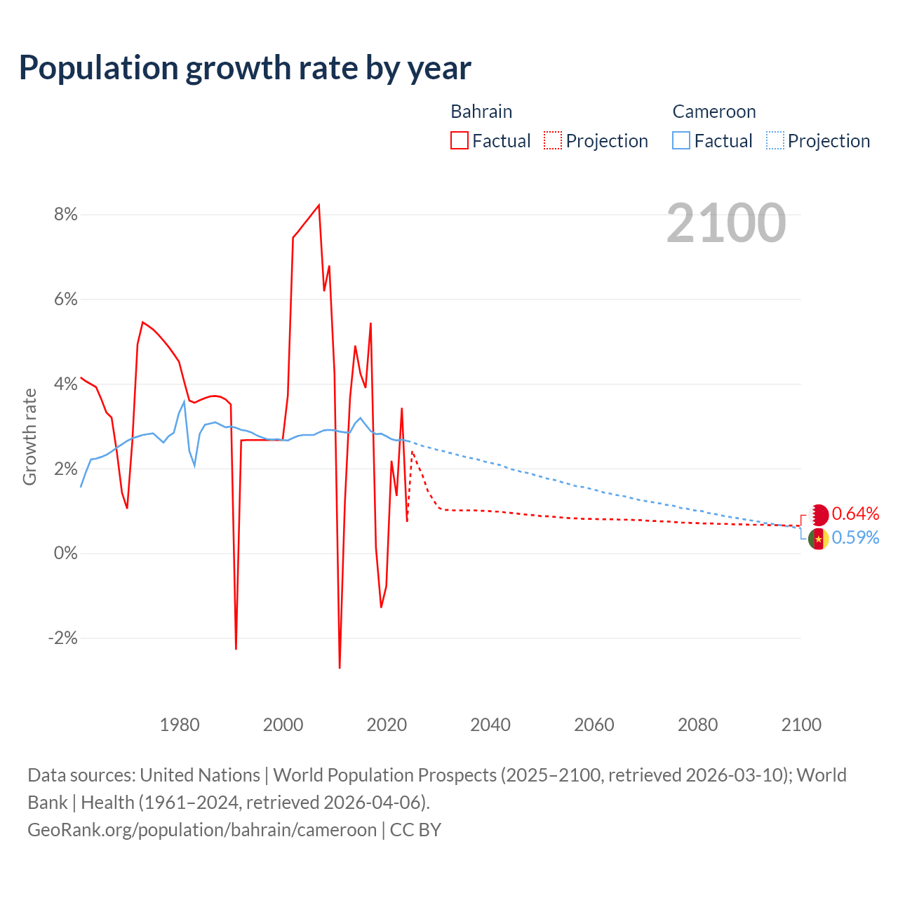 - For the last 10 years, Bahrain has had an average growth rate of +2.2% per year vs +2.84% in Cameroon.