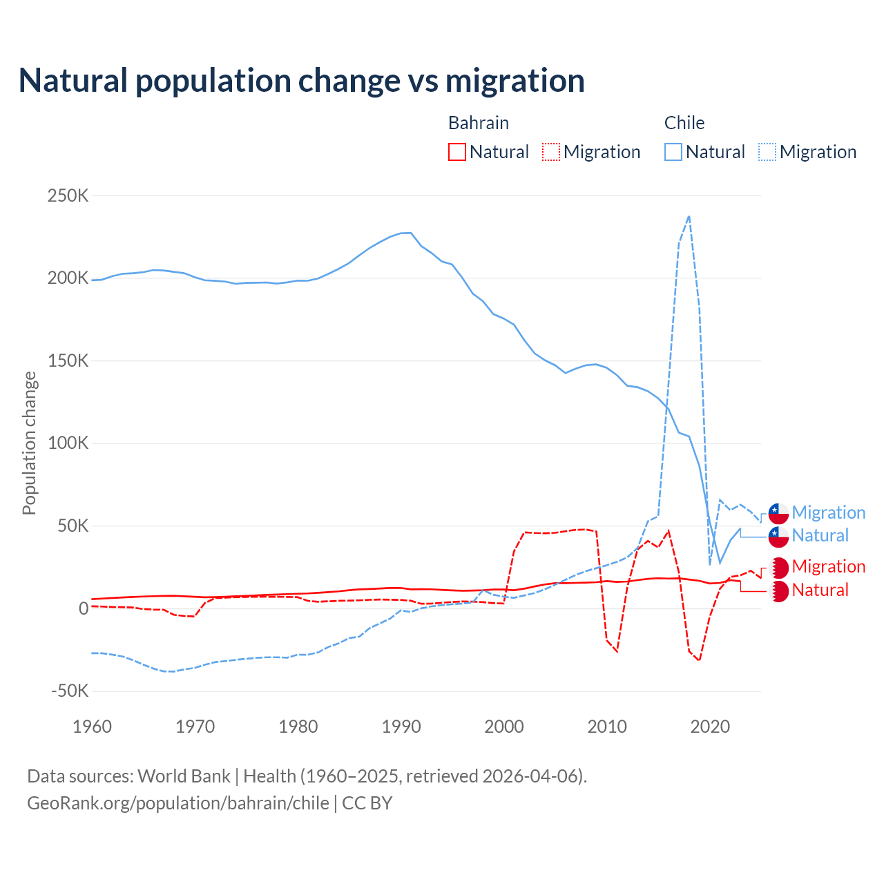 Over the last 10 years, 55.9% of the population change in Bahrain is from natural causes (a gain of 170,110 people) and 44.1% is from migration (a gain of 134,281 people). In Chile 43.5% is from natural causes (a gain of 844,683 people) and 56.5% is from migration (a gain of 1,097,597 people).