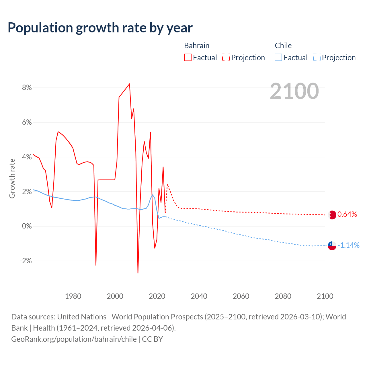 - For the last 10 years, Bahrain has had an average growth rate of +2.2% per year vs +1.02% in Chile.