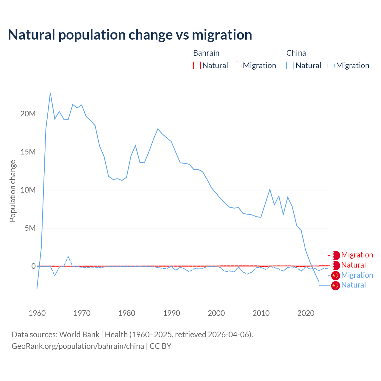 Over the last 10 years, 55.9% of the population change in Bahrain is from natural causes (a gain of 170,110 people) and 44.1% is from migration (a gain of 134,281 people). In China 92.5% is from natural causes (a gain of 42,414,528 people) and 7.53% is from migration (a loss of 3,452,923 people).