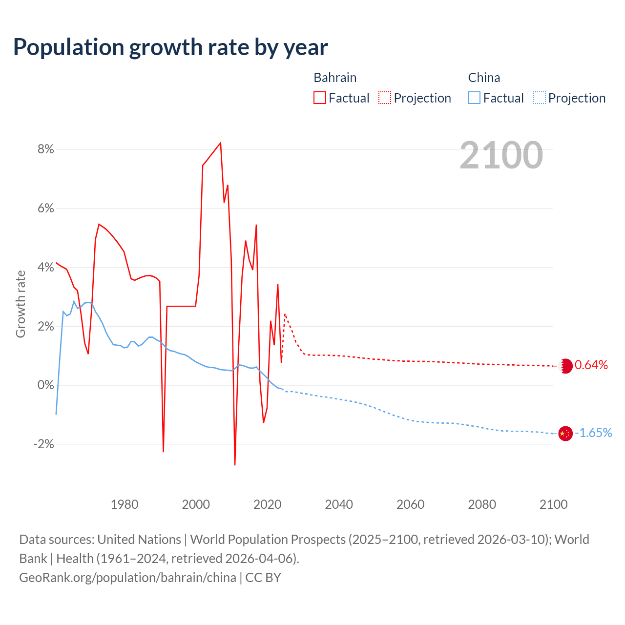 - For the last 10 years, Bahrain has had an average growth rate of +2.2% per year vs +0.3% in China.