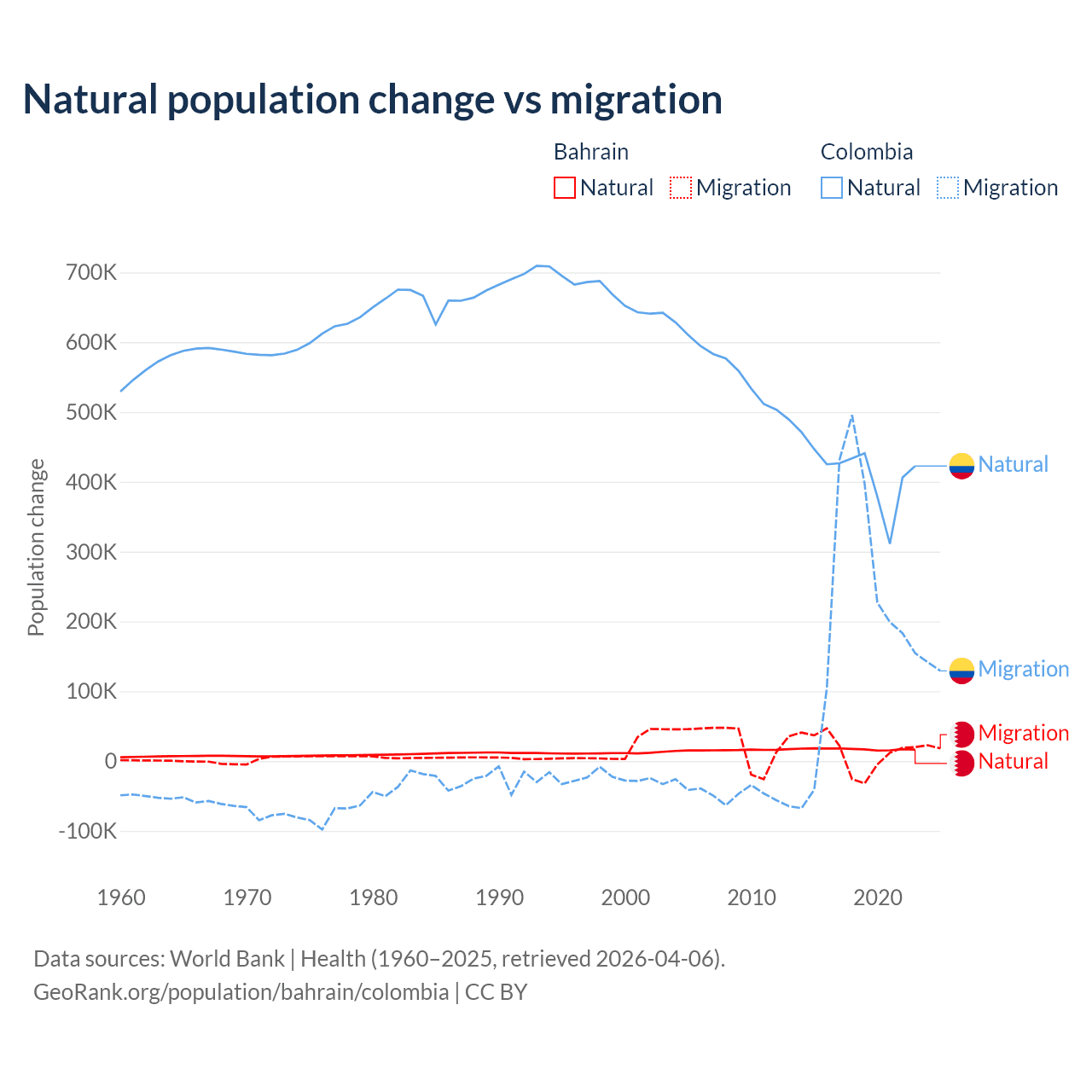 Over the last 10 years, 55.9% of the population change in Bahrain is from natural causes (a gain of 170,110 people) and 44.1% is from migration (a gain of 134,281 people). In Colombia 66.6% is from natural causes (a gain of 4,162,856 people) and 33.4% is from migration (a gain of 2,083,051 people).