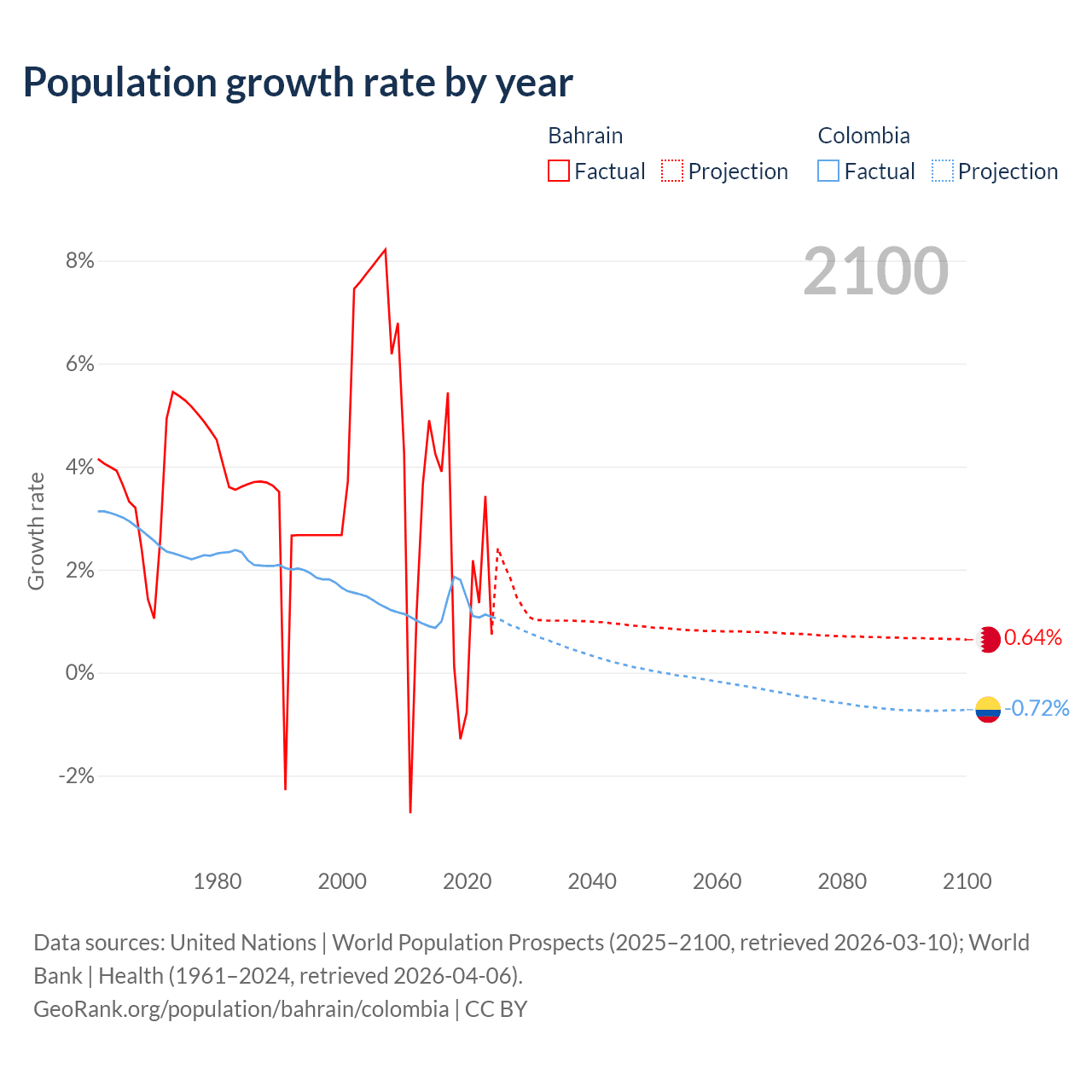 - For the last 10 years, Bahrain has had an average growth rate of +2.2% per year vs +1.25% in Colombia.