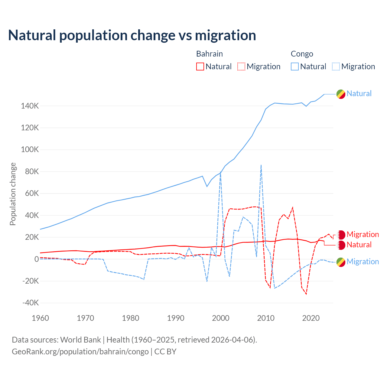 Over the last 10 years, 55.9% of the population change in Bahrain is from natural causes (a gain of 170,110 people) and 44.1% is from migration (a gain of 134,281 people). In the Congo 94% is from natural causes (a gain of 1,434,056 people) and 6.04% is from migration (a loss of 92,251 people).