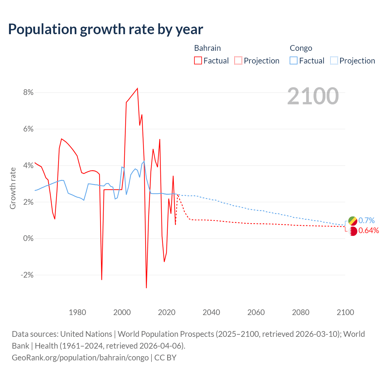 - For the last 10 years, Bahrain has had an average growth rate of +2.2% per year vs +2.44% in the Congo.