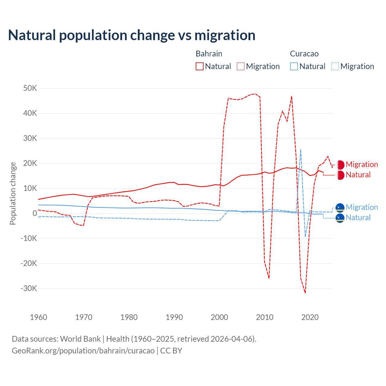 Over the last 10 years, 55.9% of the population change in Bahrain is from natural causes (a gain of 170,110 people) and 44.1% is from migration (a gain of 134,281 people). In Curacao 3.72% is from natural causes (a gain of 834 people) and 96.3% is from migration (a gain of 21,615 people).
