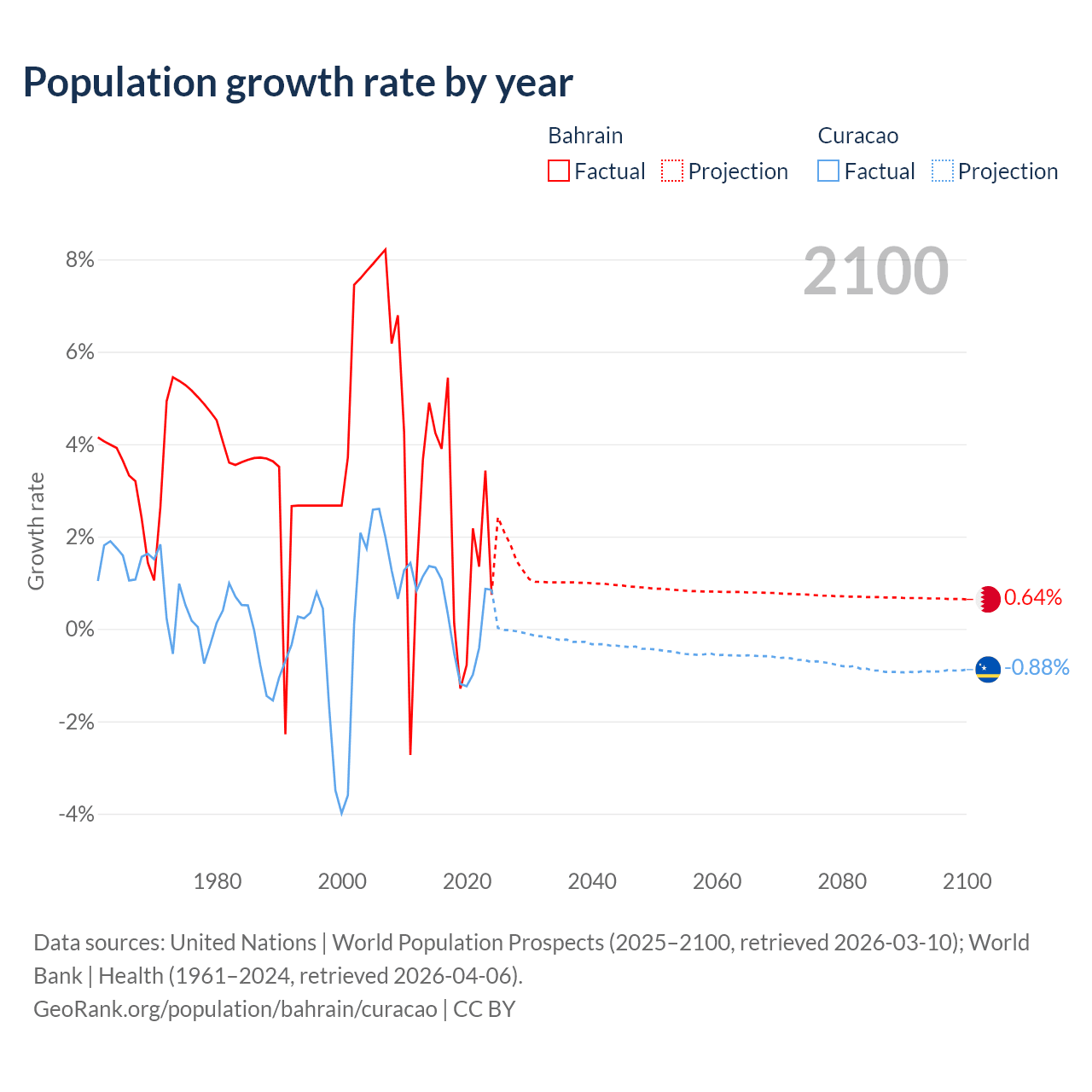 - For the last 10 years, Bahrain has had an average growth rate of +2.2% per year vs +0.13% in Curacao.