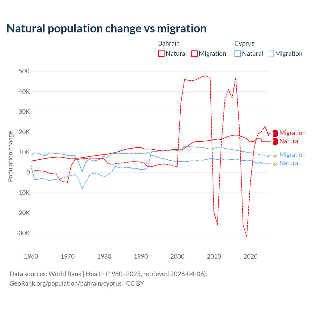 Over the last 10 years, 55.9% of the population change in Bahrain is from natural causes (a gain of 170,110 people) and 44.1% is from migration (a gain of 134,281 people). In Cyprus 36.2% is from natural causes (a gain of 57,464 people) and 63.8% is from migration (a gain of 101,458 people).