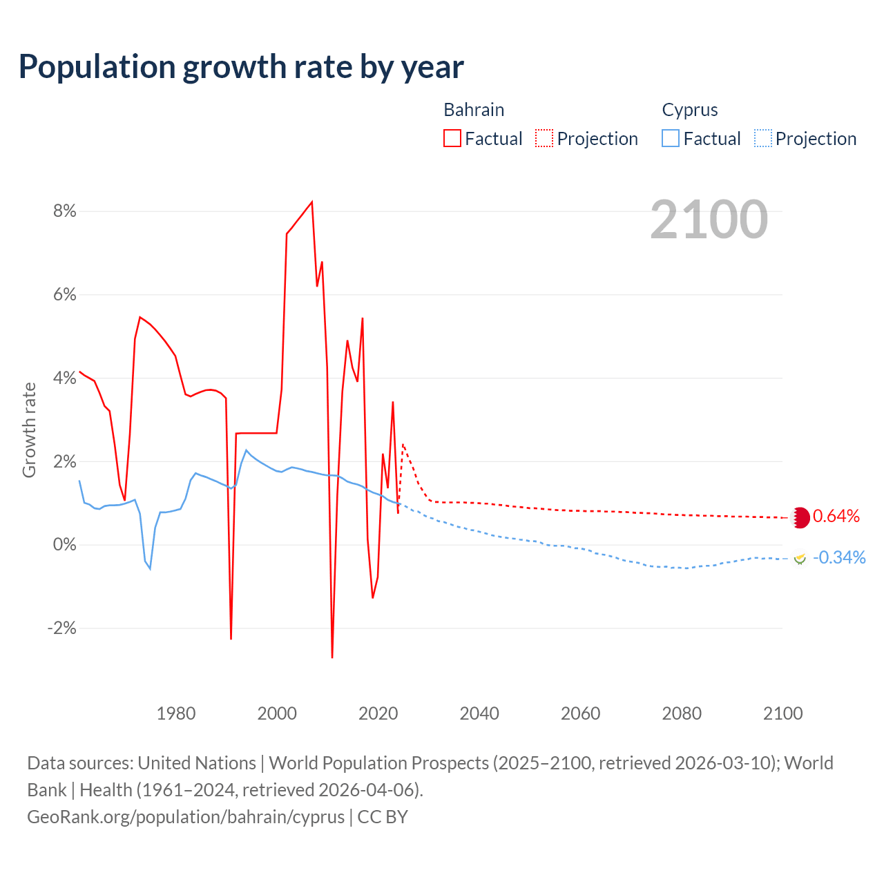 - For the last 10 years, Bahrain has had an average growth rate of +2.2% per year vs +1.26% in Cyprus.