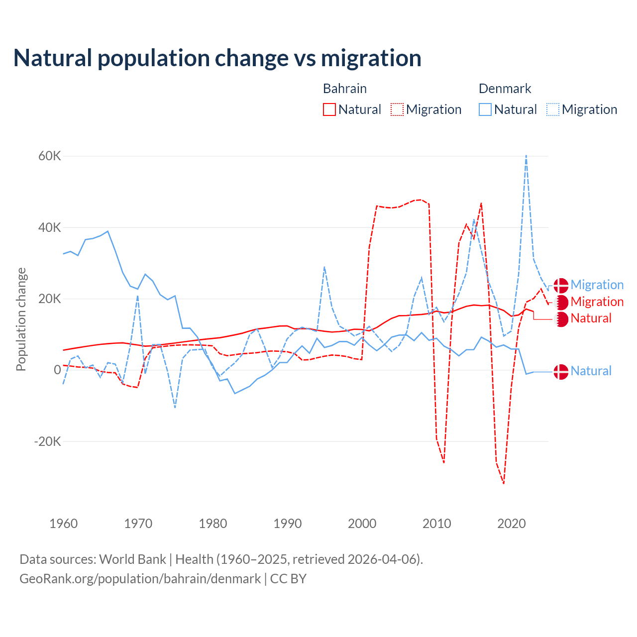 Over the last 10 years, 55.9% of the population change in Bahrain is from natural causes (a gain of 170,110 people) and 44.1% is from migration (a gain of 134,281 people). In Denmark 15.4% is from natural causes (a gain of 51,826 people) and 84.6% is from migration (a gain of 284,848 people).