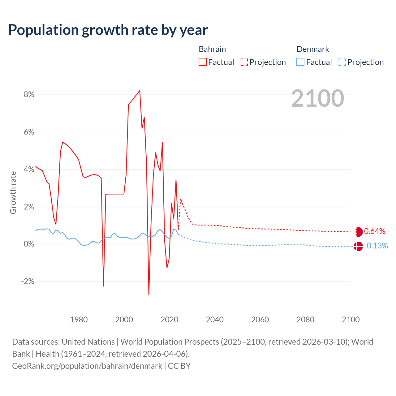 - For the last 10 years, Bahrain has had an average growth rate of +2.2% per year vs +0.57% in Denmark.