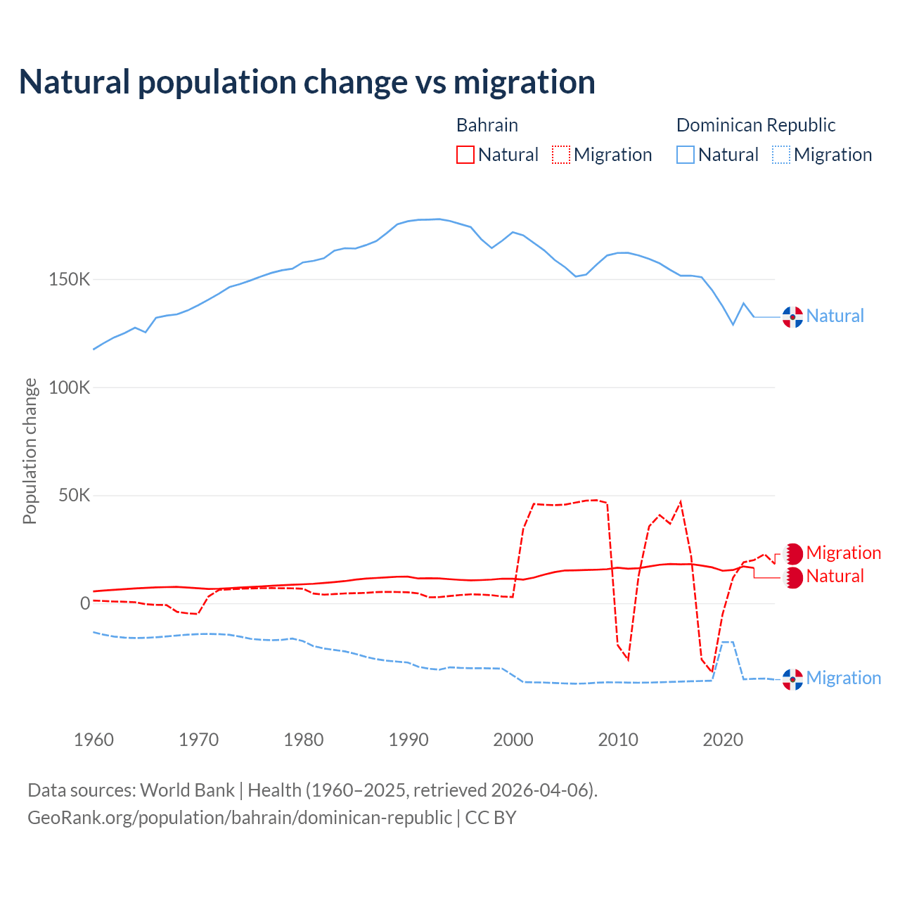 Over the last 10 years, 55.9% of the population change in Bahrain is from natural causes (a gain of 170,110 people) and 44.1% is from migration (a gain of 134,281 people). In the Dominican Republic 81.8% is from natural causes (a gain of 1,447,764 people) and 18.2% is from migration (a loss of 322,919 people).