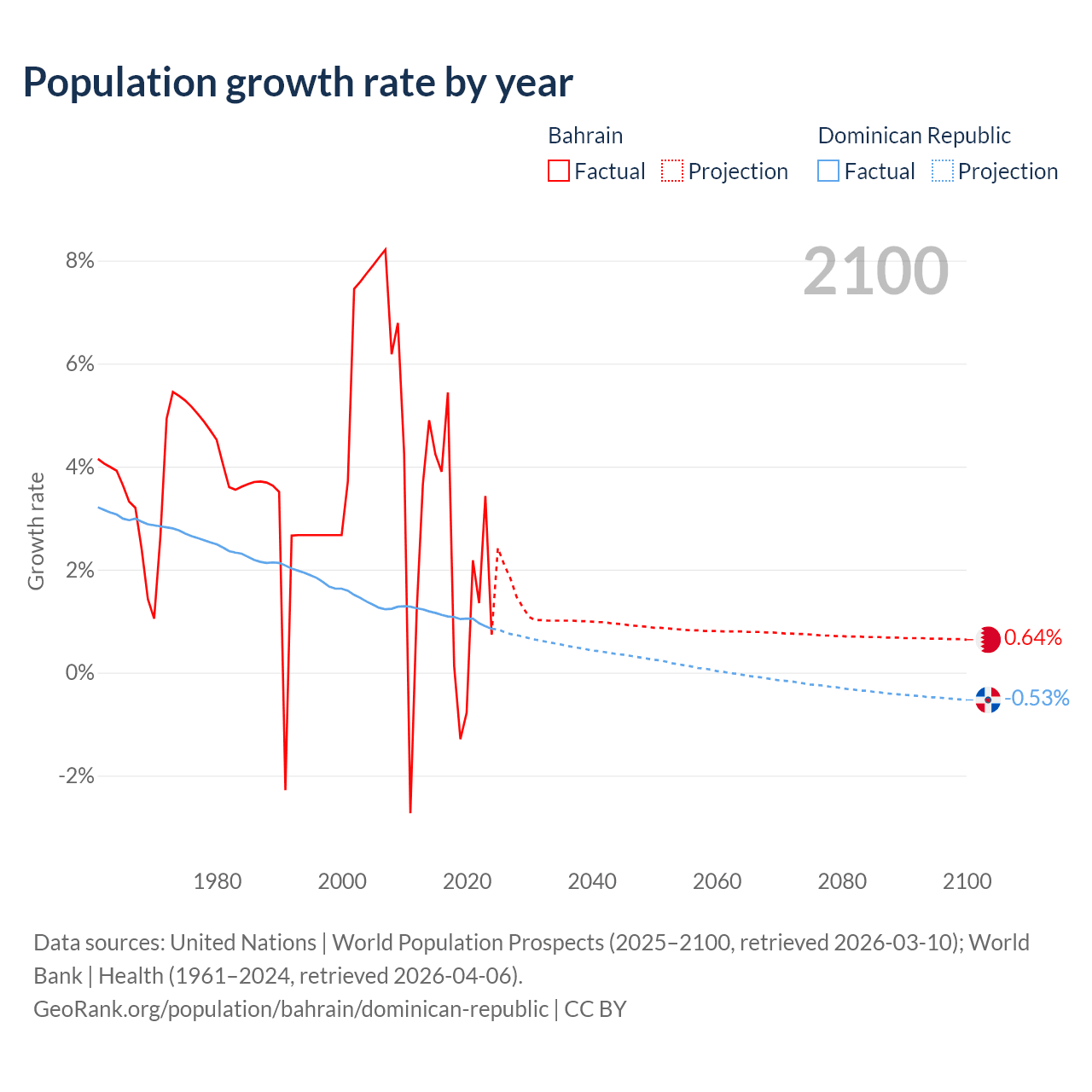 - For the last 10 years, Bahrain has had an average growth rate of +2.2% per year vs +1.04% in the Dominican Republic.