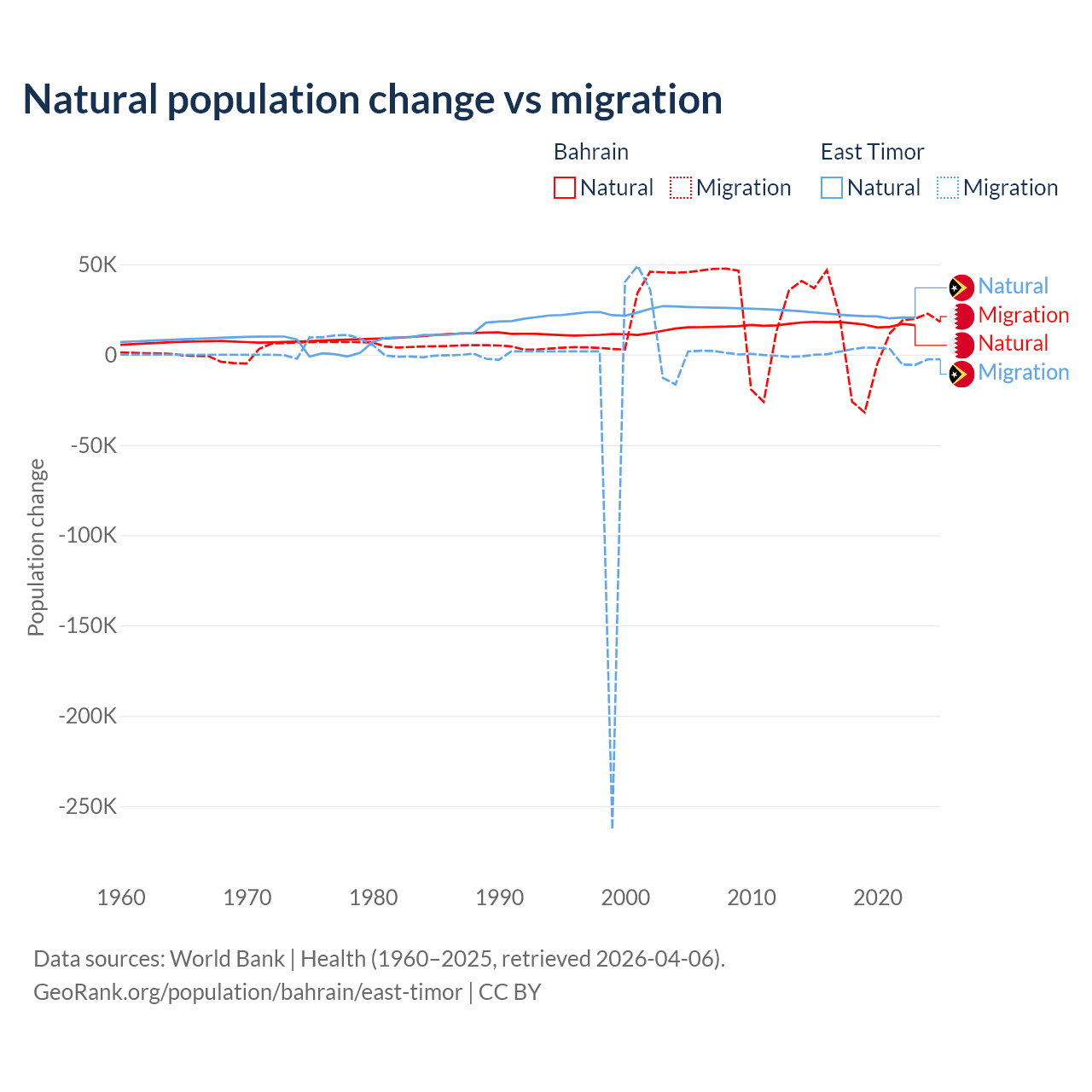 Over the last 10 years, 55.9% of the population change in Bahrain is from natural causes (a gain of 170,110 people) and 44.1% is from migration (a gain of 134,281 people). In East Timor 98.3% is from natural causes (a gain of 217,698 people) and 1.66% is from migration (a gain of 3,665 people).