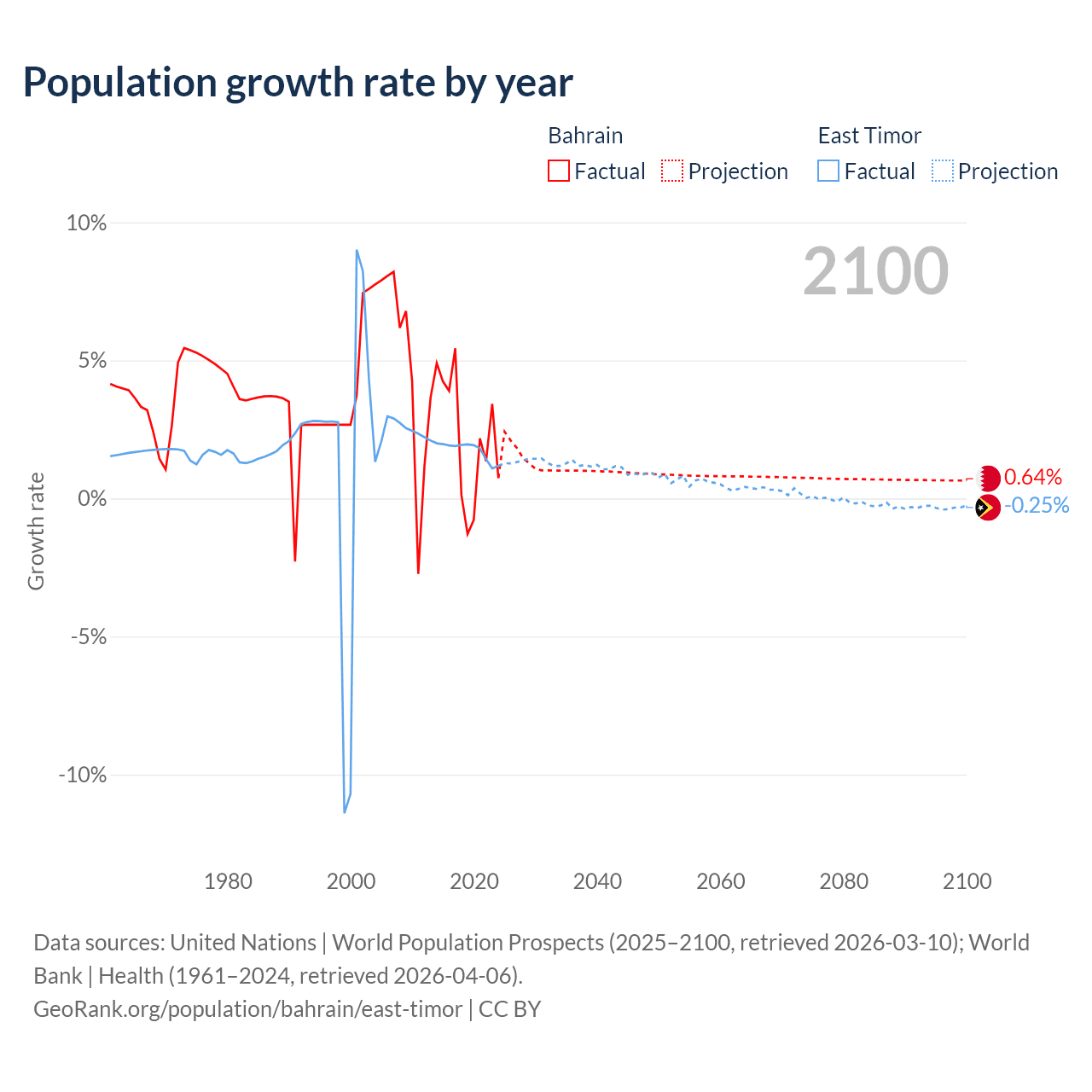 - For the last 10 years, Bahrain has had an average growth rate of +2.2% per year vs +1.74% in East Timor.
