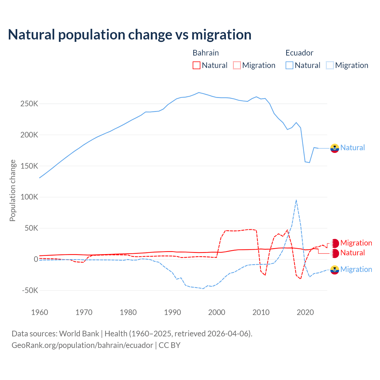 Over the last 10 years, 55.9% of the population change in Bahrain is from natural causes (a gain of 170,110 people) and 44.1% is from migration (a gain of 134,281 people). In Ecuador 91.9% is from natural causes (a gain of 1,964,352 people) and 8.08% is from migration (a gain of 172,707 people).
