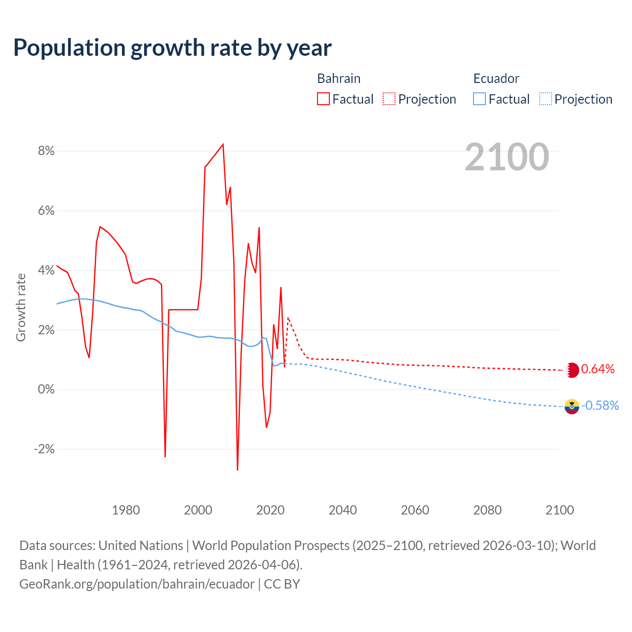 - For the last 10 years, Bahrain has had an average growth rate of +2.2% per year vs +1.26% in Ecuador.