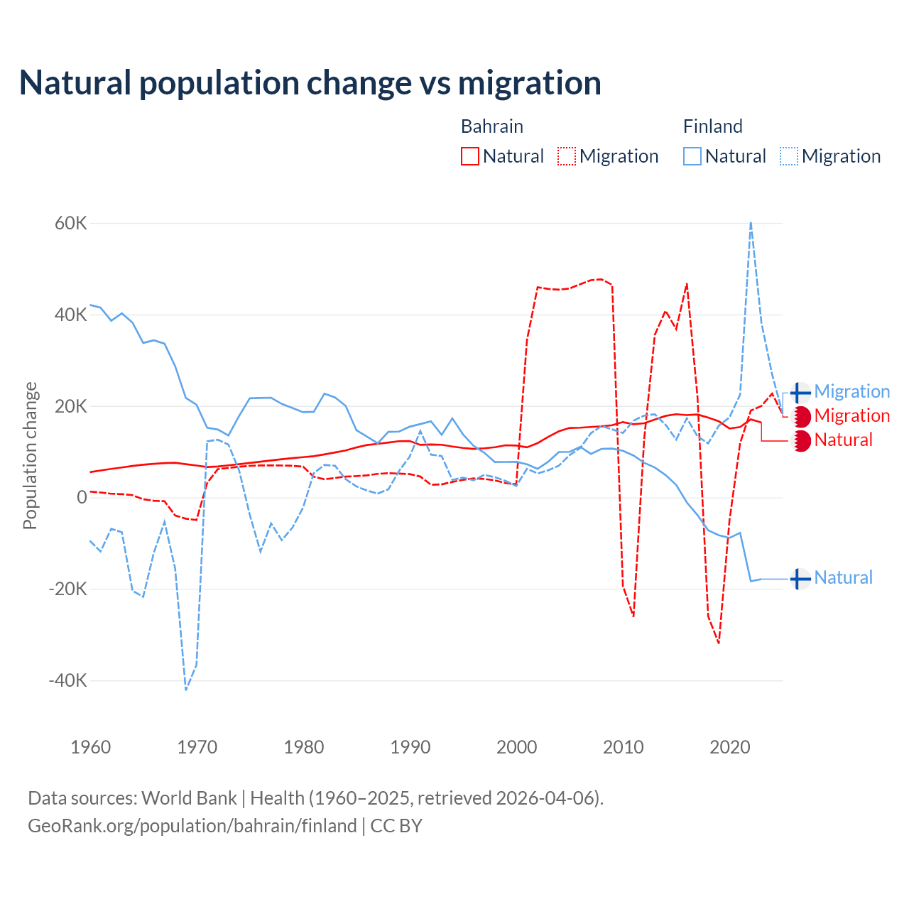 Over the last 10 years, 55.9% of the population change in Bahrain is from natural causes (a gain of 170,110 people) and 44.1% is from migration (a gain of 134,281 people). In Finland 22.5% is from natural causes (a loss of 65,560 people) and 77.5% is from migration (a gain of 225,237 people).