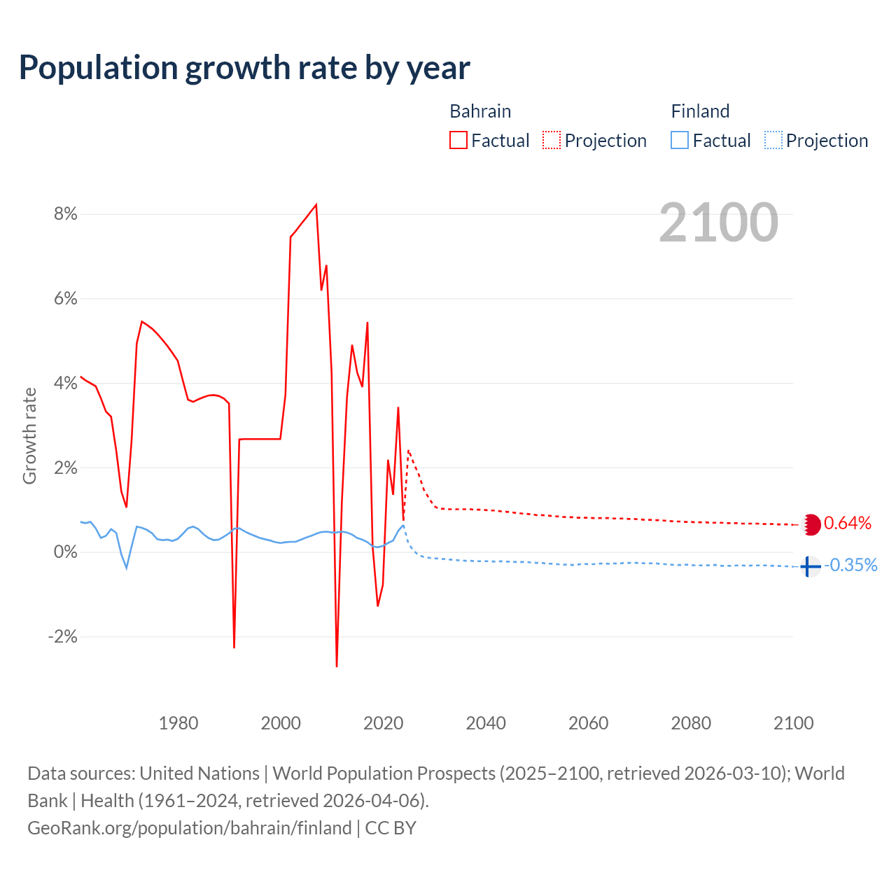 - For the last 10 years, Bahrain has had an average growth rate of +2.2% per year vs +0.3% in Finland.