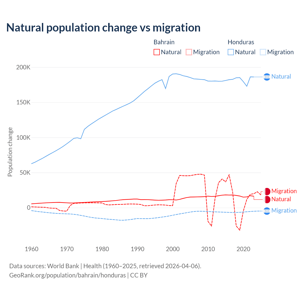 Over the last 10 years, 55.9% of the population change in Bahrain is from natural causes (a gain of 170,110 people) and 44.1% is from migration (a gain of 134,281 people). In Honduras 96.7% is from natural causes (a gain of 1,821,125 people) and 3.29% is from migration (a loss of 61,965 people).