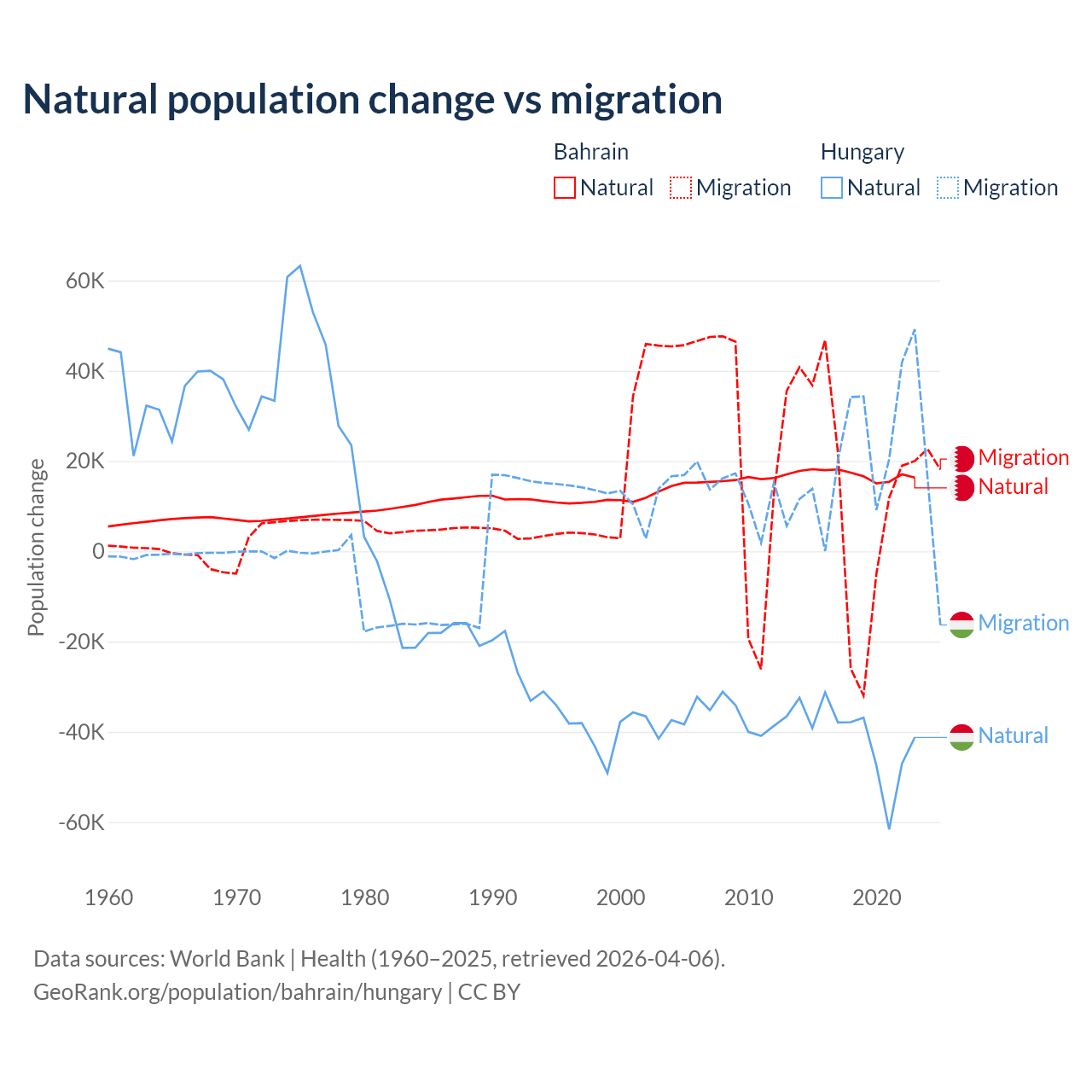 Over the last 10 years, 55.9% of the population change in Bahrain is from natural causes (a gain of 170,110 people) and 44.1% is from migration (a gain of 134,281 people). In Hungary 63.7% is from natural causes (a loss of 412,838 people) and 36.3% is from migration (a gain of 234,837 people).