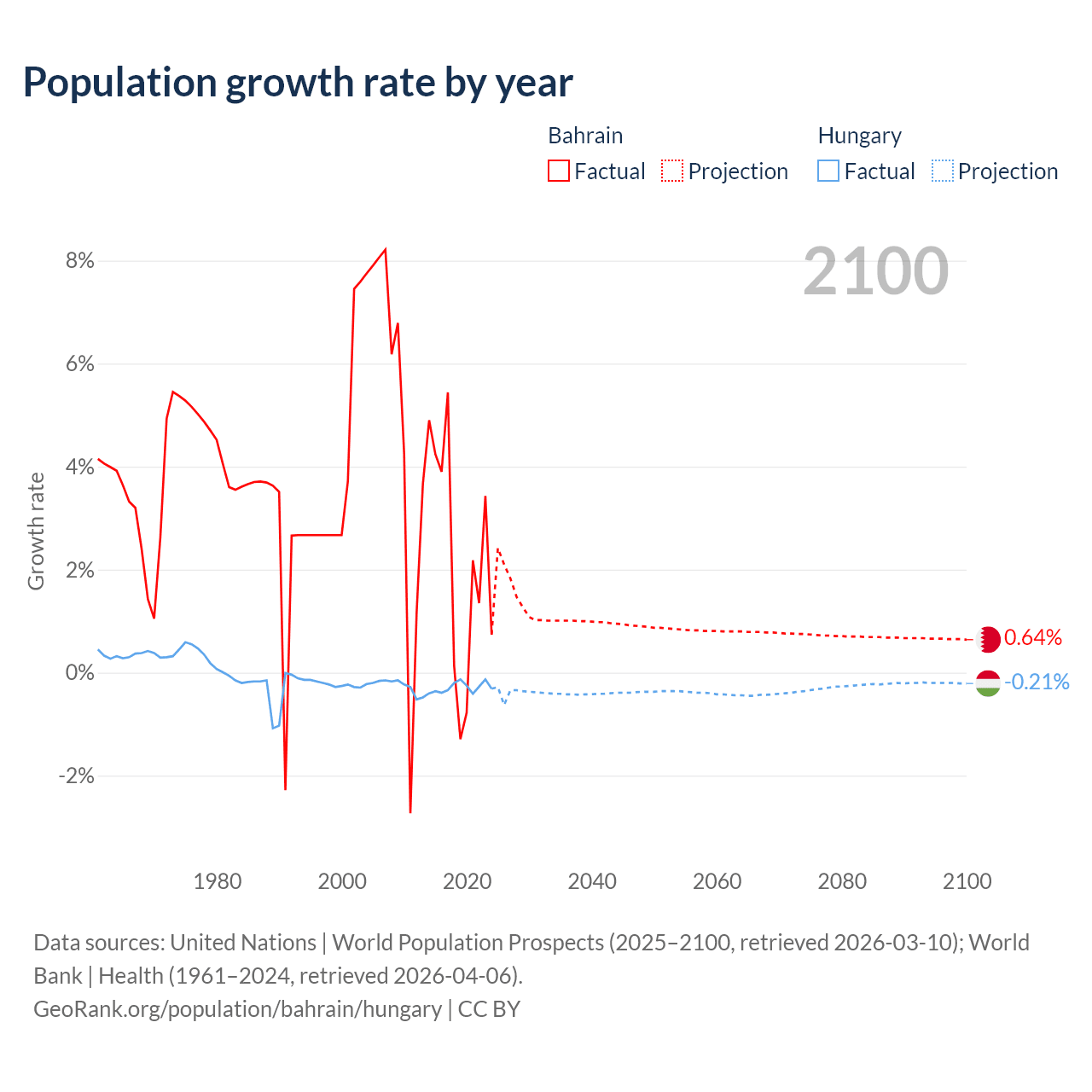- Since 2006, the population of Bahrain has increased from 960K people to 1.67M (73.8% growth), while Hungary has declined from 10.1M to 9.48M (5.92% decline).