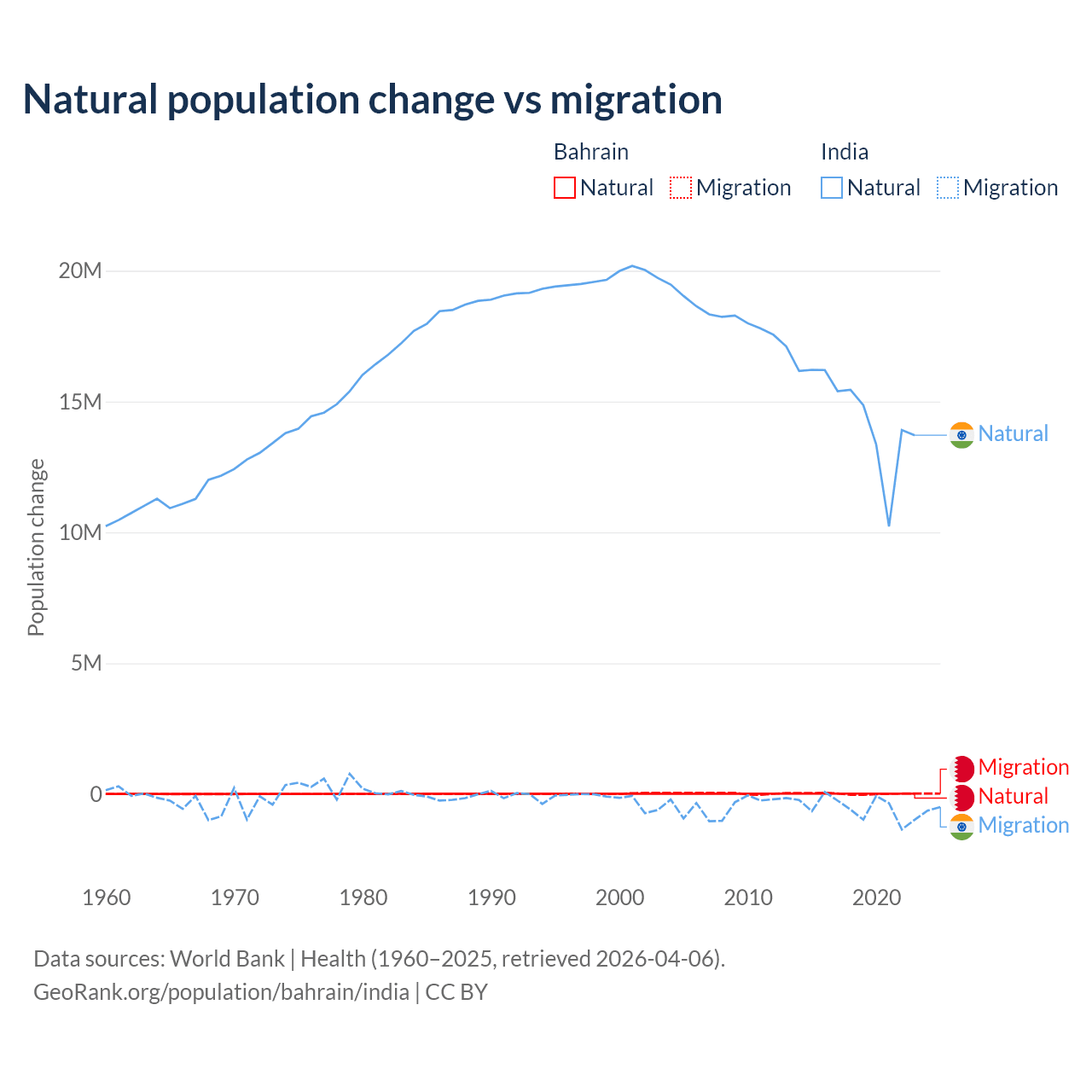 Over the last 10 years, 55.9% of the population change in Bahrain is from natural causes (a gain of 170,110 people) and 44.1% is from migration (a gain of 134,281 people). In India 96.4% is from natural causes (a gain of 145,503,378 people) and 3.56% is from migration (a loss of 5,376,884 people).