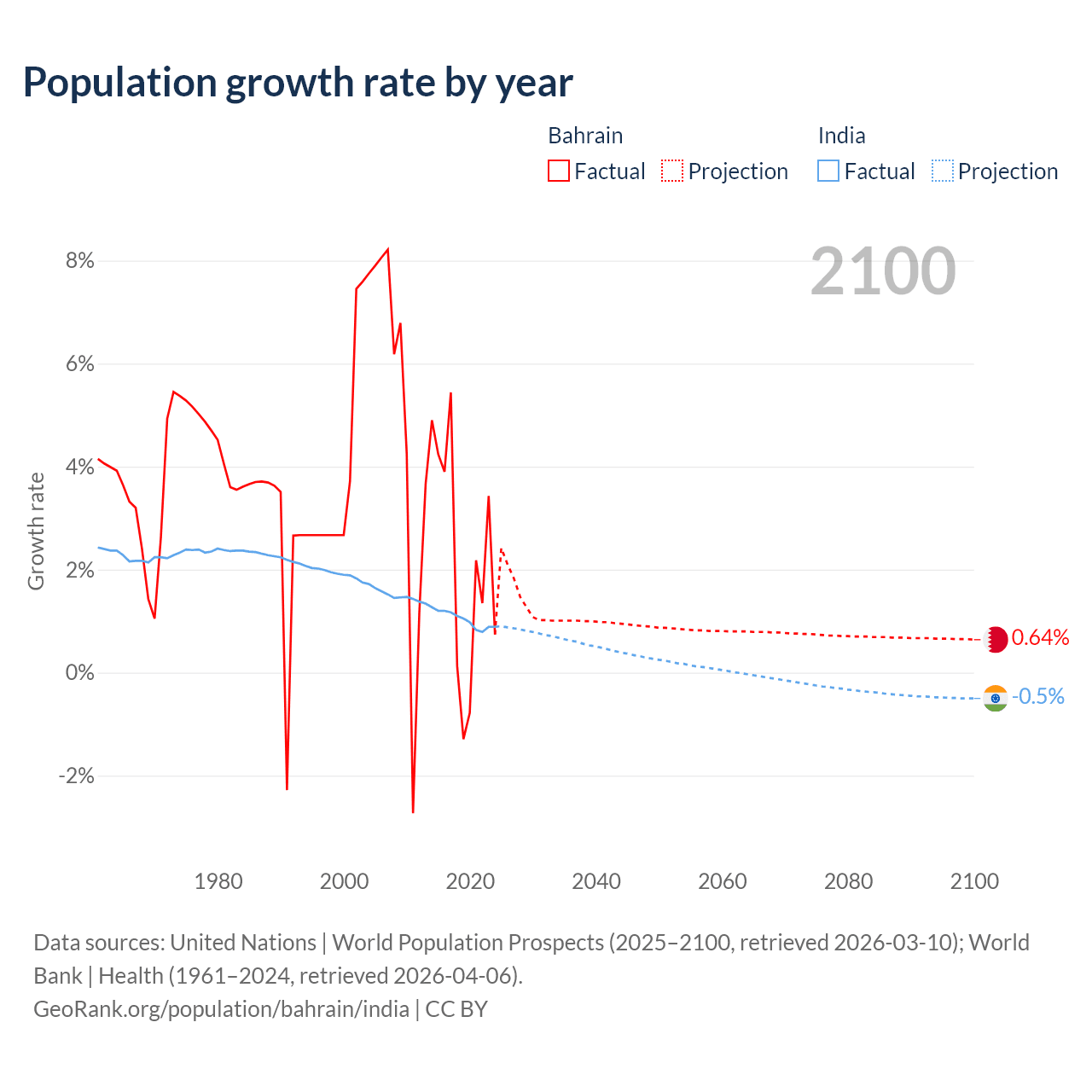- For the last 10 years, Bahrain has had an average growth rate of +2.2% per year vs +1.03% in India.