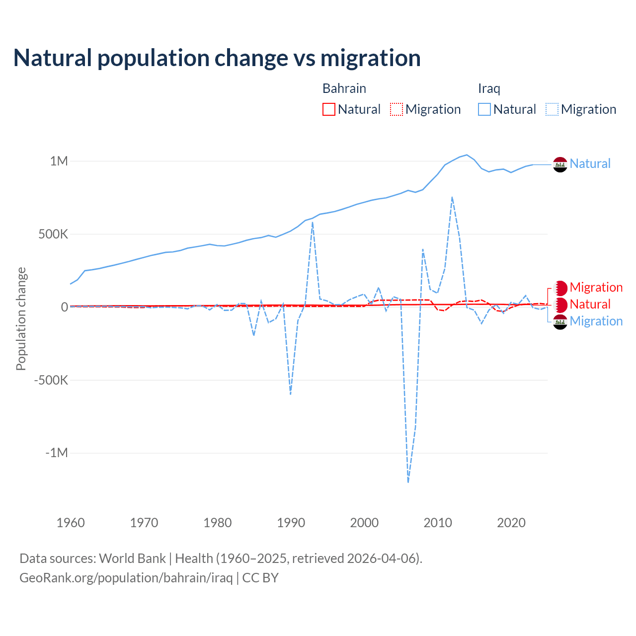 Over the last 10 years, 55.9% of the population change in Bahrain is from natural causes (a gain of 170,110 people) and 44.1% is from migration (a gain of 134,281 people). In Iraq 99.2% is from natural causes (a gain of 9,598,842 people) and 0.76% is from migration (a loss of 73,050 people).