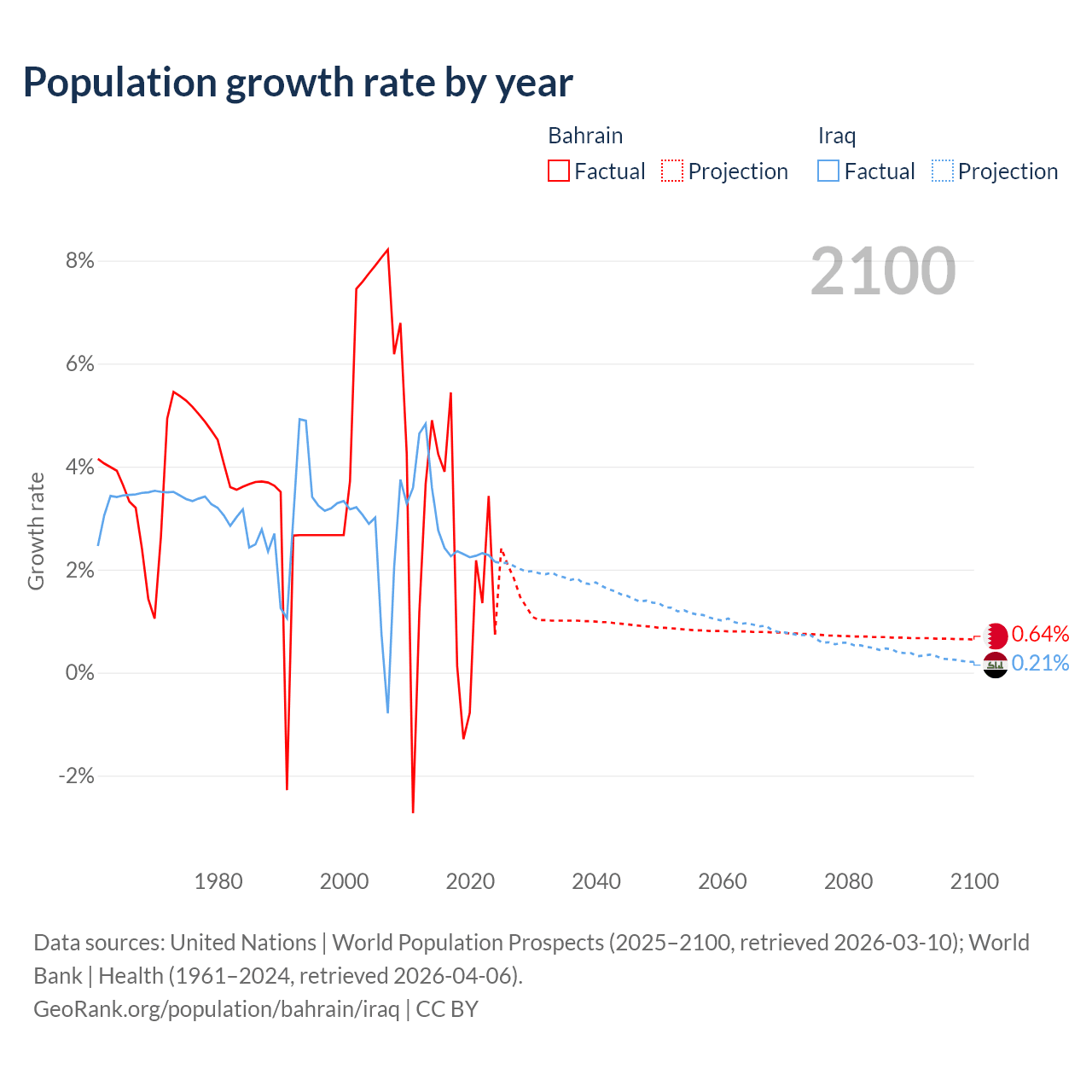 - Since 2006, the population of Bahrain has increased from 960K people to 1.67M (73.8% growth), while Iraq has grown from 28.6M to 48.3M (68.7% growth).