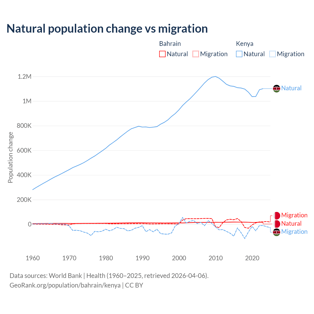 Over the last 10 years, 55.9% of the population change in Bahrain is from natural causes (a gain of 170,110 people) and 44.1% is from migration (a gain of 134,281 people). In Kenya 95.3% is from natural causes (a gain of 10,892,362 people) and 4.67% is from migration (a loss of 533,876 people).