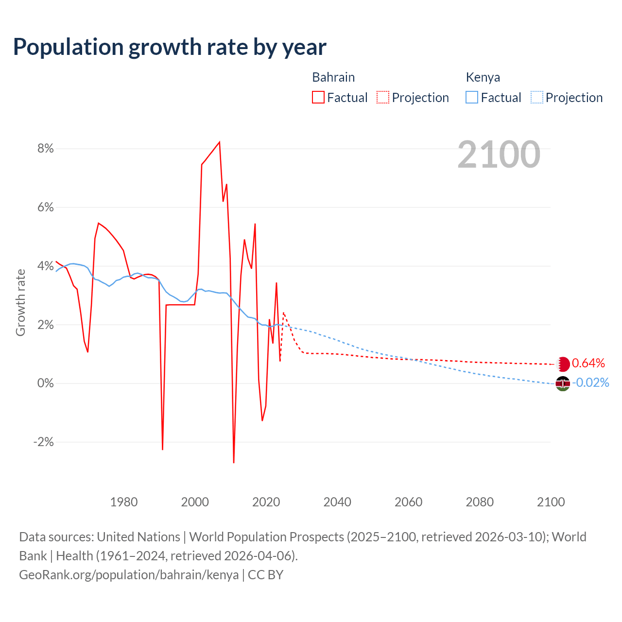 - Since 2006, the population of Bahrain has increased from 960K people to 1.67M (73.8% growth), while Kenya has grown from 36.9M to 59M (59.8% growth).
